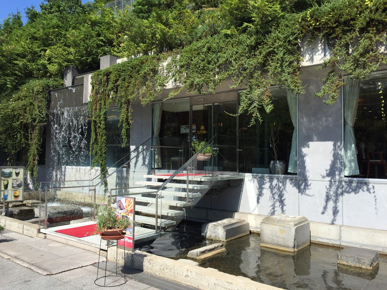 アクロス福岡に隣接している喫茶店です。店の入り口には滝があり、見るものを楽しませてくれますし、涼感も得られます。場所代なのか、食事系は他のカフェと比べると若干高めで、カレーが1500円くらいしました。