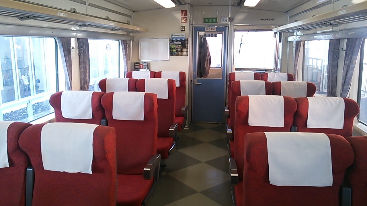 国鉄製の183系という3両編成の特急用ディーゼルカーが使用され、指定席車両は2両、自由席車両は1両となっています。