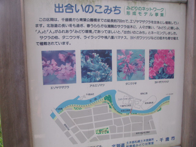 JR千歳駅からはグリーンベルトと千歳川沿いの散策路を通じて行くと一番判りやすいかと思いますが、問題は千歳橋からです。青葉公園に直接向かう場合は、この橋を渡らずに川沿いの左岸に通じている自転車道を進むと、その名も青葉公園橋と呼ばれる橋があり、ここを渡って公園にアクセスすることが出来ますが、このルートですと、千歳神社に参拝することが出来ません。千歳神社経由で行く場合は、千歳橋を渡ってから鳥居がある所を曲がって参拝路へと続きますが、ここから青葉公園に行く道は看板が少なく、知らないと迷ってしまう可能性があります。千歳神社経由で公園へ行かれる方は地図をよくご確認の上目指すようにして下さい。