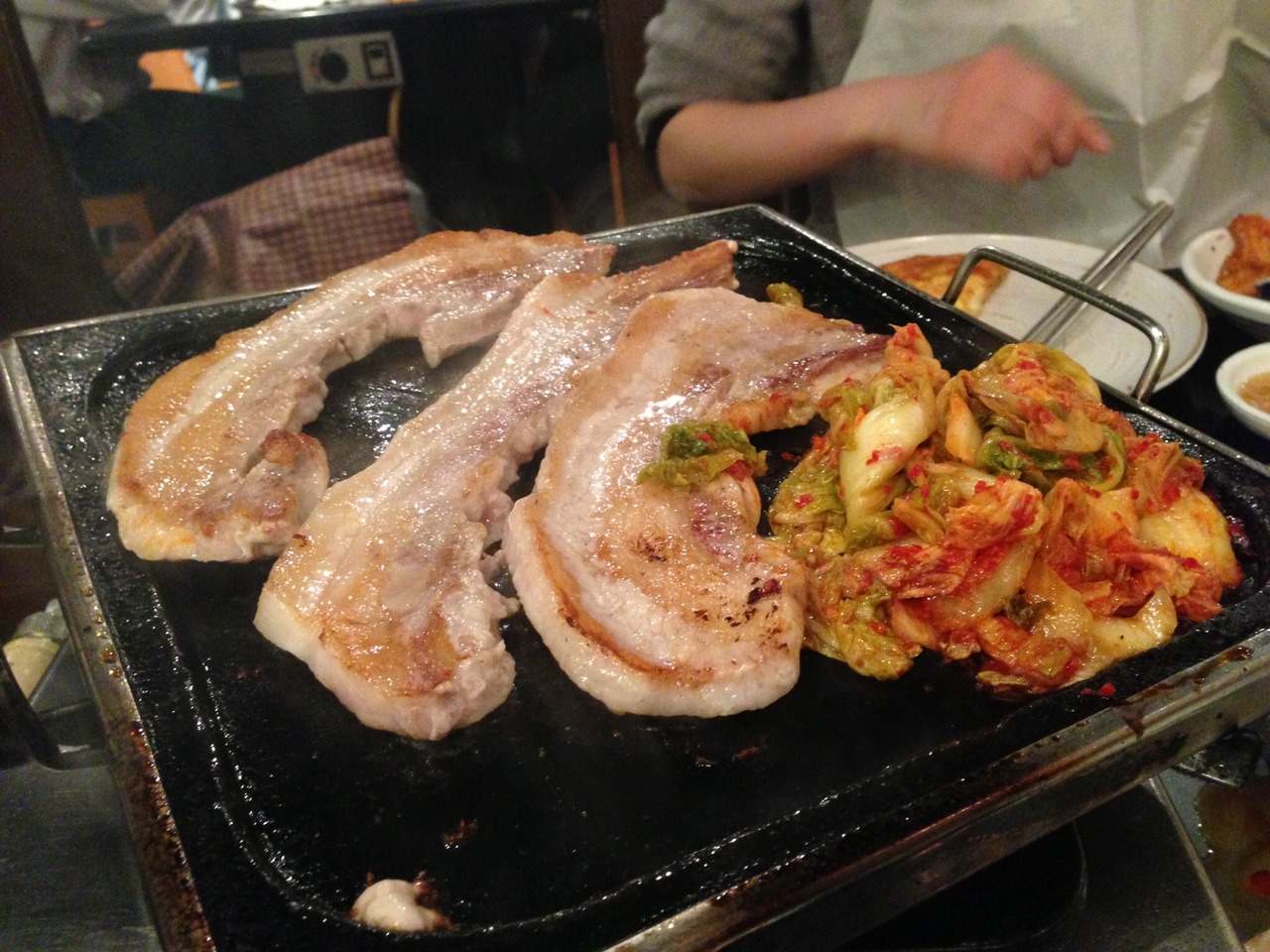 ここのサムギョプサルやチーズチヂミが好きで、毎回頼みます。