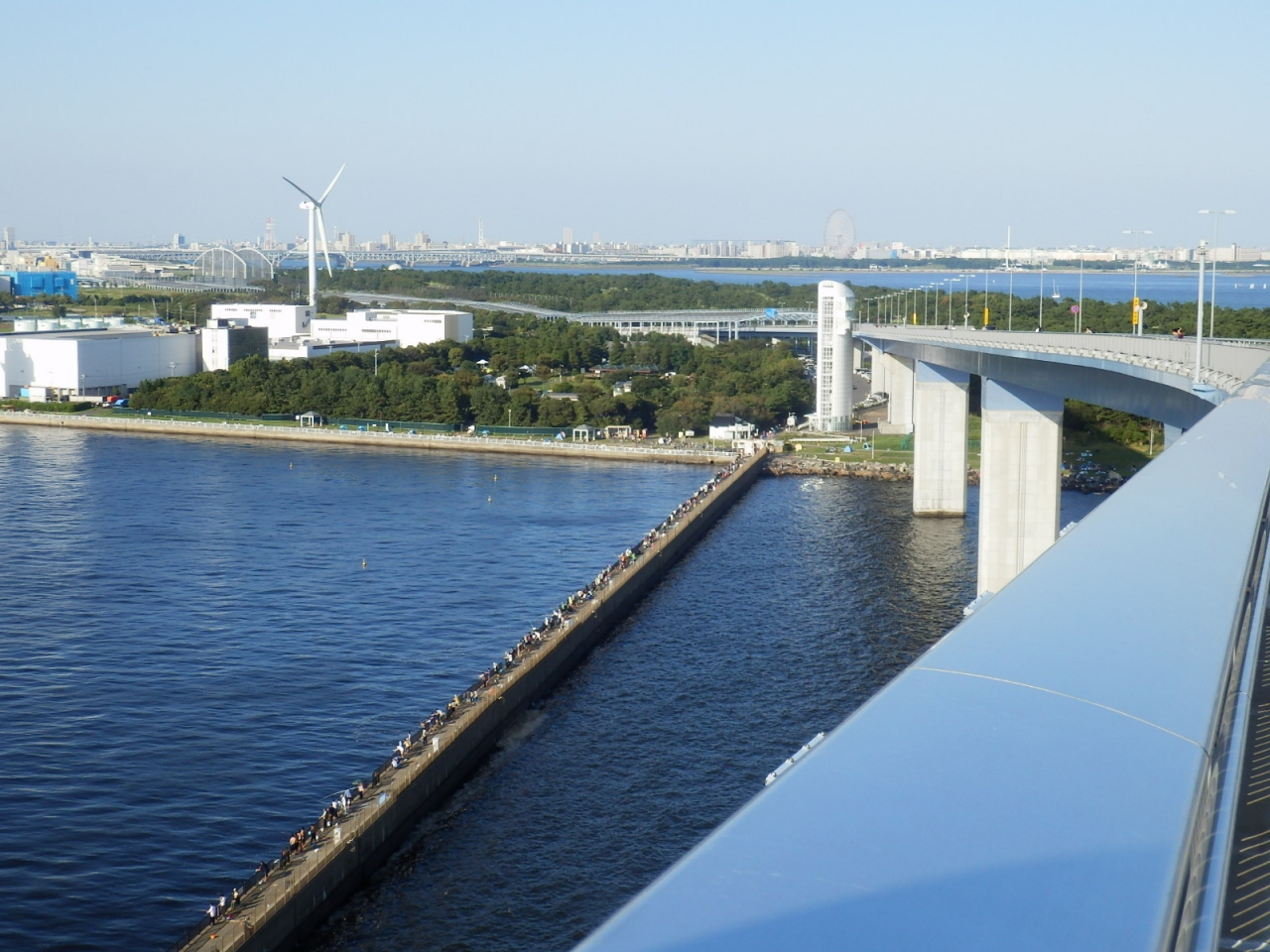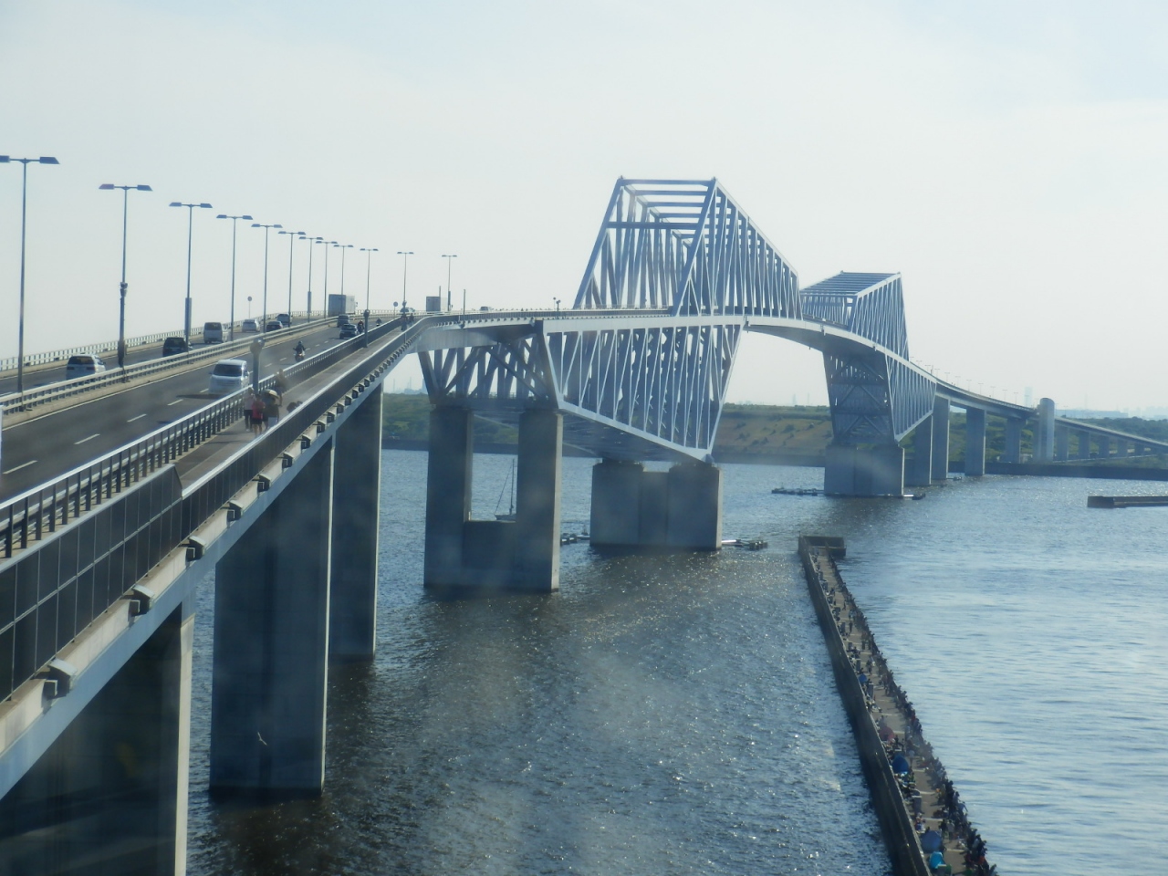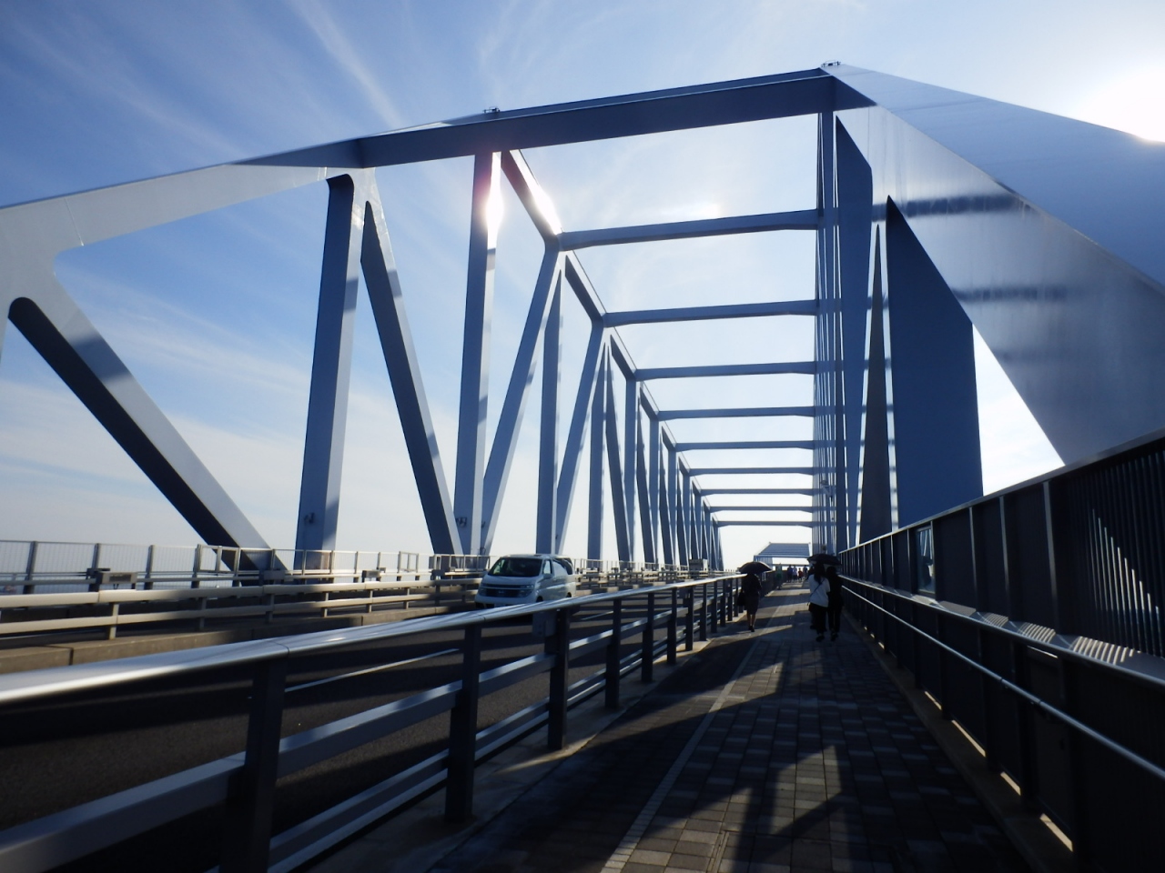 二頭の恐竜が向き合っているような形をしている新しい橋です。橋は江東区立若洲公園から伸びているのですが、エレベーターが設置してあり、橋の上を歩くことが出来ます。橋からはお台場や豊洲を眺められましたし、上空には羽田空港を離着陸する飛行機も飛び交っていて、楽しめました。