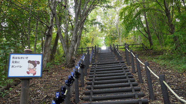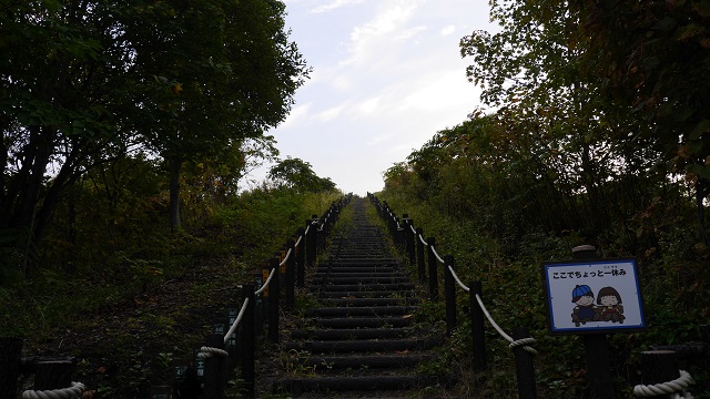 採掘作業などの中で発生した不要な岩石を積み上げて作られた人口の山であるズリ山。炭鉱が閉山した今は観光施設として頂上まで登ることができる。ちょうど777段の階段を上がると赤平の市街地を一望できる見事な風景に出会えることができる。階段を700段以上も上がるのは結構疲れるので登り切ったときの達成感もひとしお。なお、下のほうは木々で覆われ鬱蒼としているのでヒグマ注意の看板も相まって結構緊張感があった。