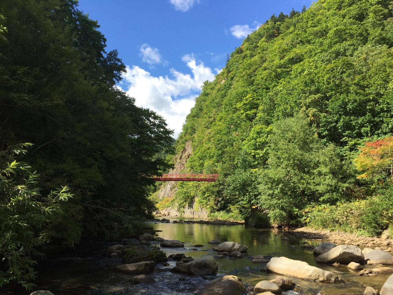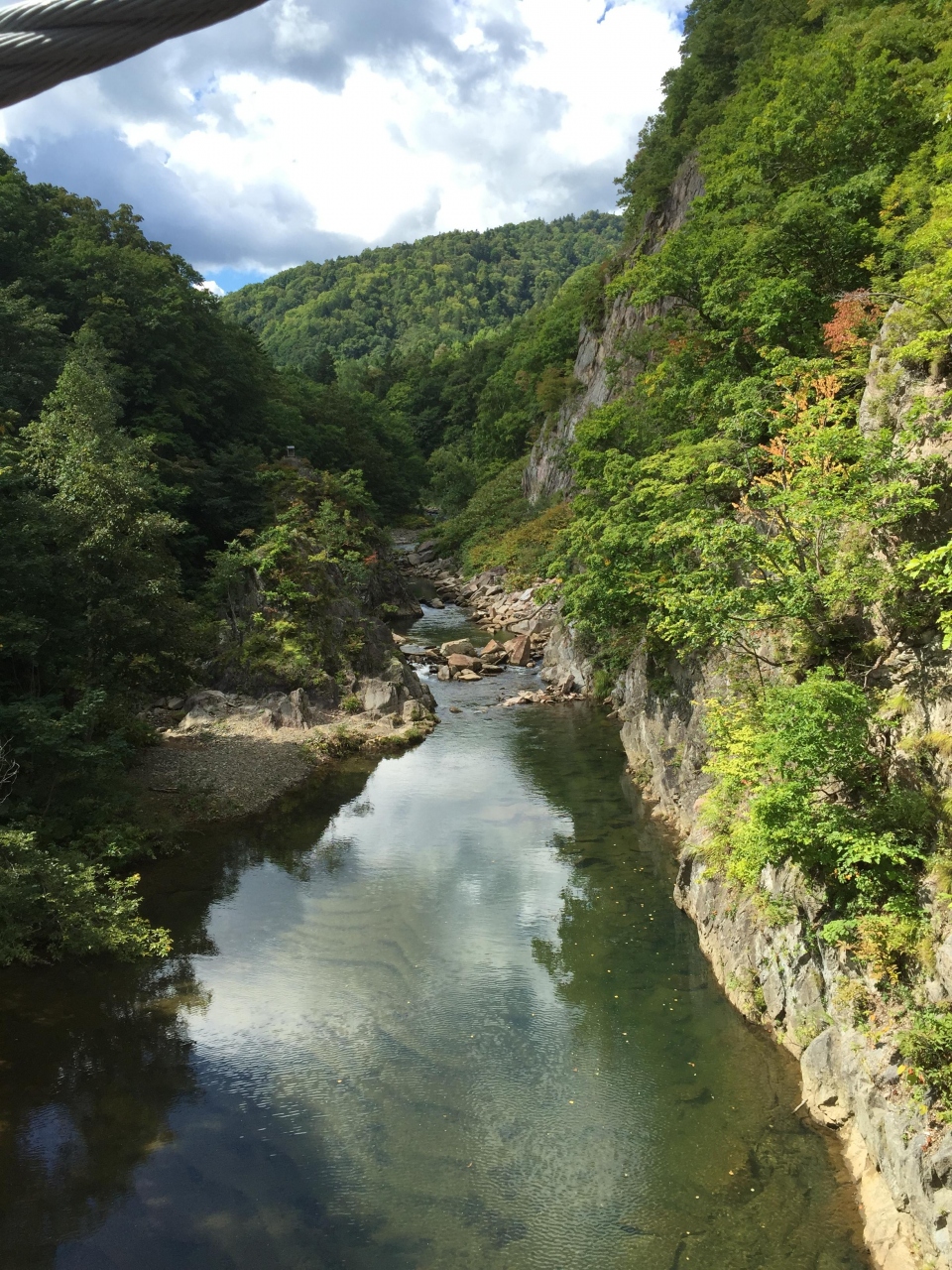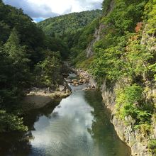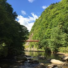 旅行中に一回は温泉に行きたいということもあり、札幌駅からバスで一時間半という割と近場に温泉地があるということで行きました。温泉に行く前に川沿いの遊歩道を散策できるということだったので行ってみました。ゆるやかに流れる川に触れる距離まで近づくことができ、川からの二見橋を見る景色はとてもきれいでした。ただ、紅葉のシーズンに行くのがおすすめだと思われます。