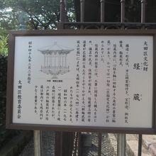 1784年に建てられた大田区指定文化財で、池上本門寺の境内にあります。内部には回転する八角形の書架があり、一切経が収められていたそうです。経蔵内部の柱等には、江戸時代後期に江戸各地から参詣した人々の氏名や、経蔵の工事に関与した職人等の氏名が刻まれているそうですが、残念ながら中に入ることはできませんでした。