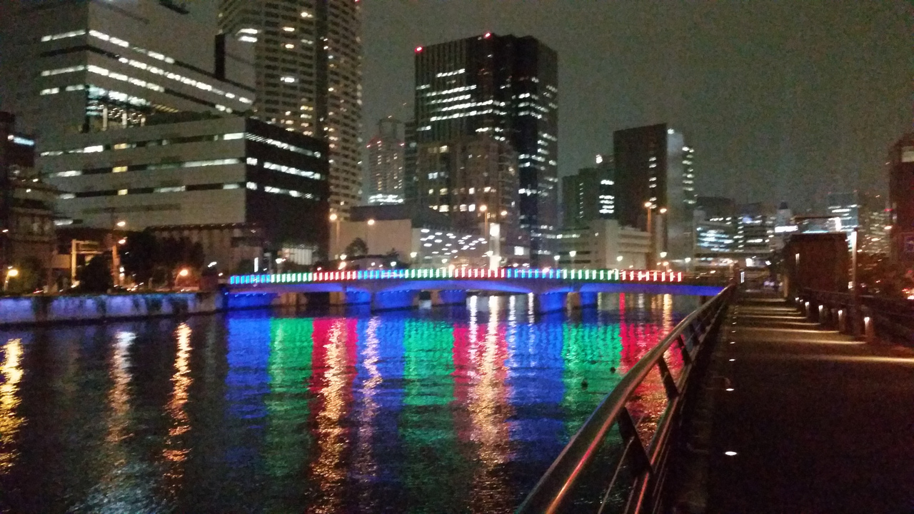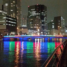 夜には欄干がカラフルに点灯され、堂島川沿いからの眺めがよいです。