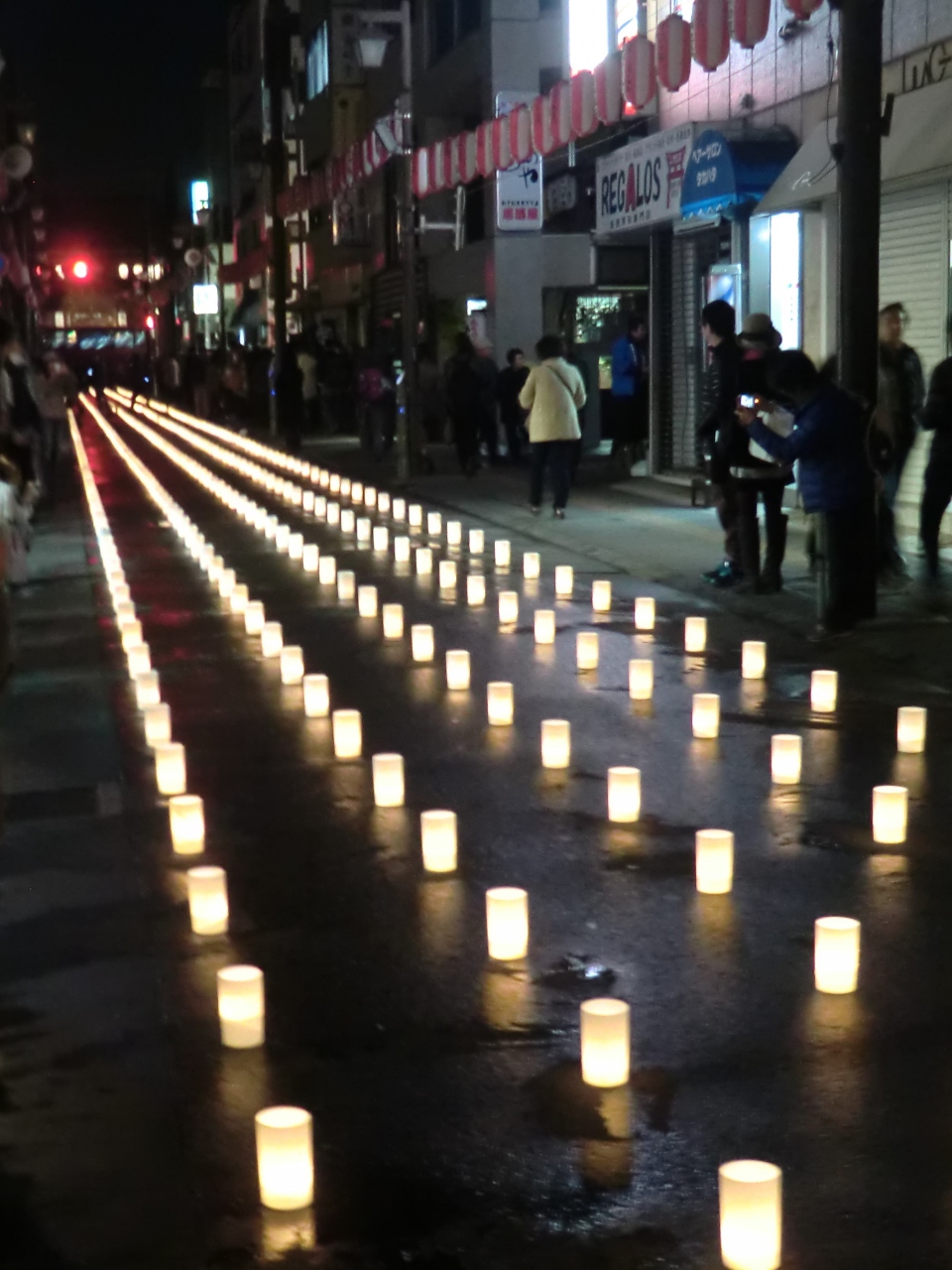 高幡不動尊の参道から駅前の商店街の前まで灯篭の光で照らされます。