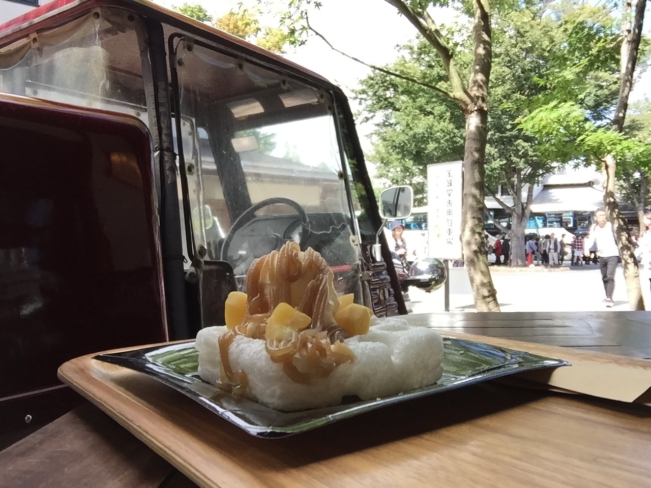 お餅をワッフルメーカーでプレスして、アイスクリームを乗せたスイーツをオーダー。お外でいただきました。マロンクリームが美味しかったです。