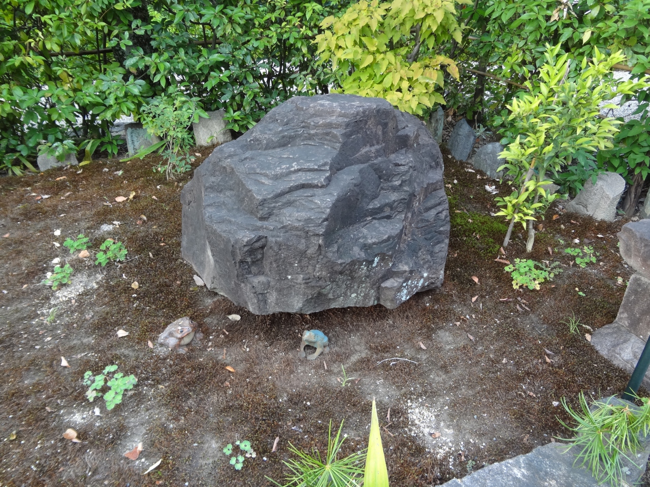 元興寺の本堂の北側にあります。五重小塔の収められた建物とは、本堂を挟んで反対側になります・大きな石の近くに、立て看板が建てられています。毎年、7月7日に蛙供養が行われるそうです。様々な言い伝えのある奇岩だそうです。