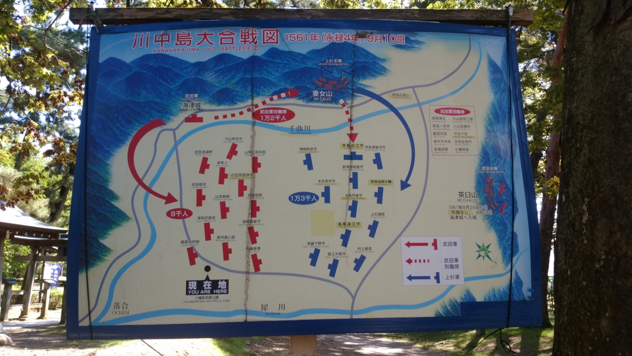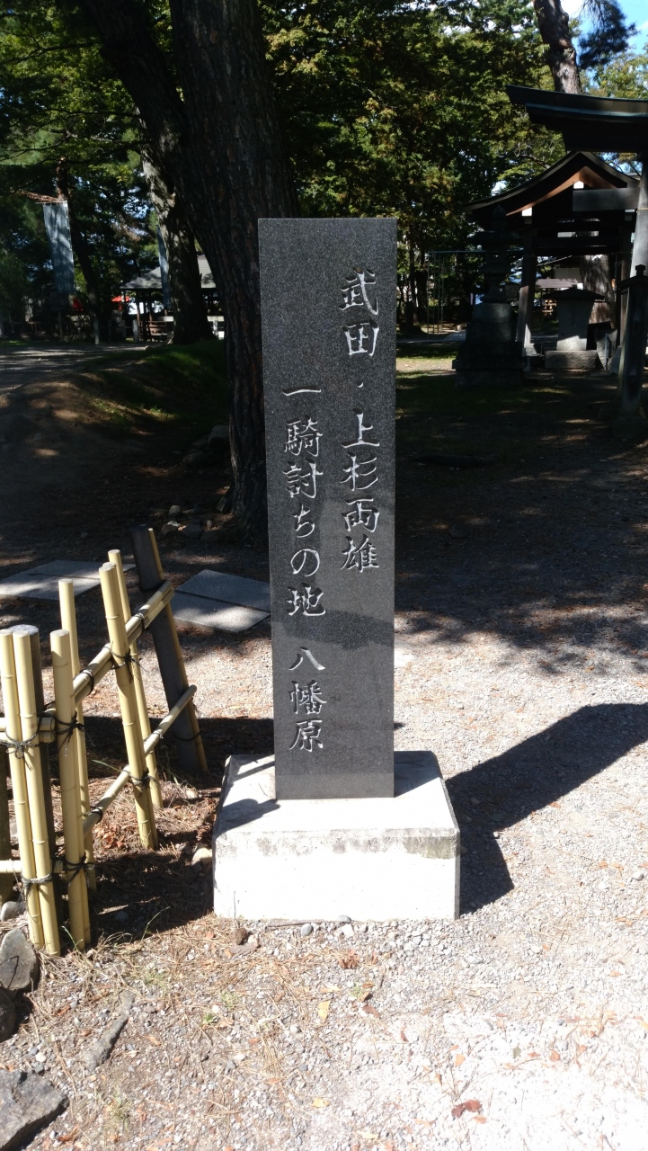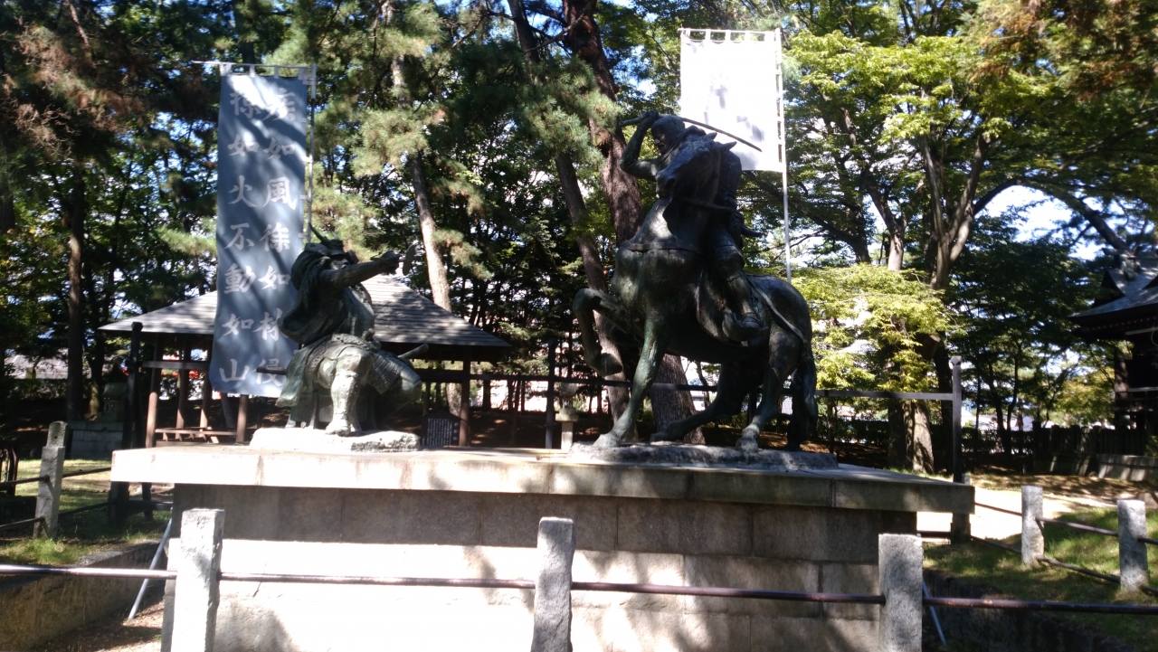 博物館を出て右手、八幡神社へ行くと武田信玄と上杉謙信の像などがあり、説明看板などを読んでいると結構な時間がかかってしまいます。