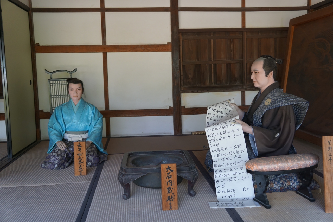 大石良雄宅跡は、大石神社の敷地内。宝物殿とかとセットになったチケットを買って入ります。入口はそうでもなかったのですが、中に入ると池のある日本庭園を中心に、藩の重臣の屋敷だった面影がそれなりに残っているように思いました。長屋門に、大石家の家族の人形が展示されていて、これも気分が出る工夫かと思います。
