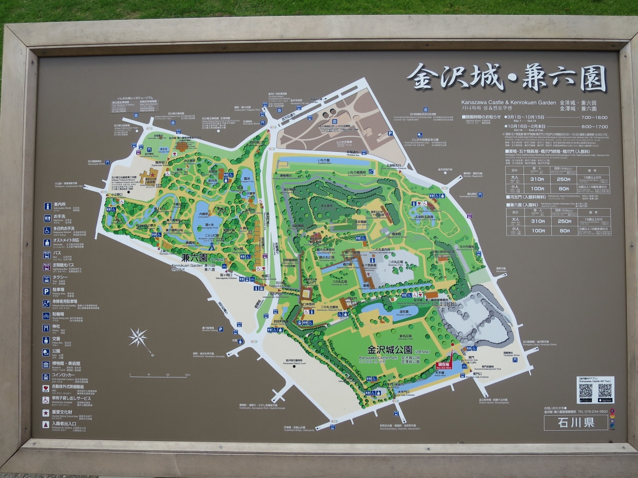 加賀百万石の加賀藩の居城で、城下町金沢の中心に位置する大きな公園です。公園内には石川門、五十間長屋、、菱櫓、河北門、二の丸、三の丸広場など見どころ満載です。しかし、加賀藩時代からの現存する建物は三十間長屋、石川門、鶴丸倉庫の3つしかなく、他はすべて復元された建物です。