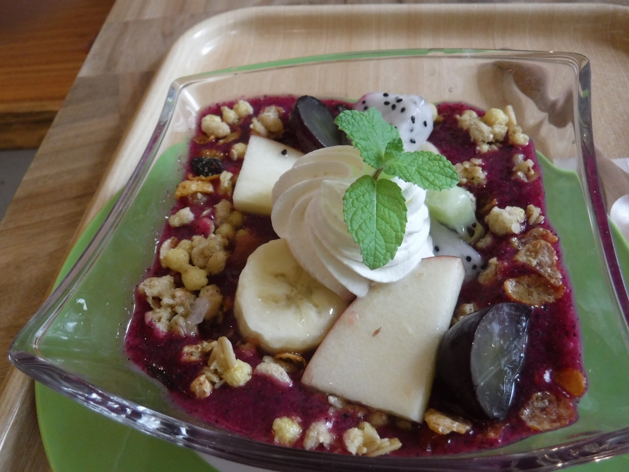 石垣島の公設市場の近くにフルーツを使ったスイーツの店が出来ました。ガイドブックにも載っている人気店です。アサイーの次にブームだといわれる、ドラゴンフルーツを使ったピタヤボールを食べました。(ドラゴンフルーツの赤)シリアルやフルーツがのっており、とても食べやすかったです。オススメです。