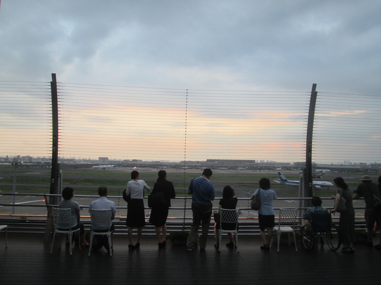 夕方の第1ターミナル展望デッキに訪問しました。晴れていれば、夕方から夜にかけては空港周辺のきれいな景色が見れます。展望デッキは普段は空いていますが、お盆休み期間中のためかたくさんの見学者が来ていました。