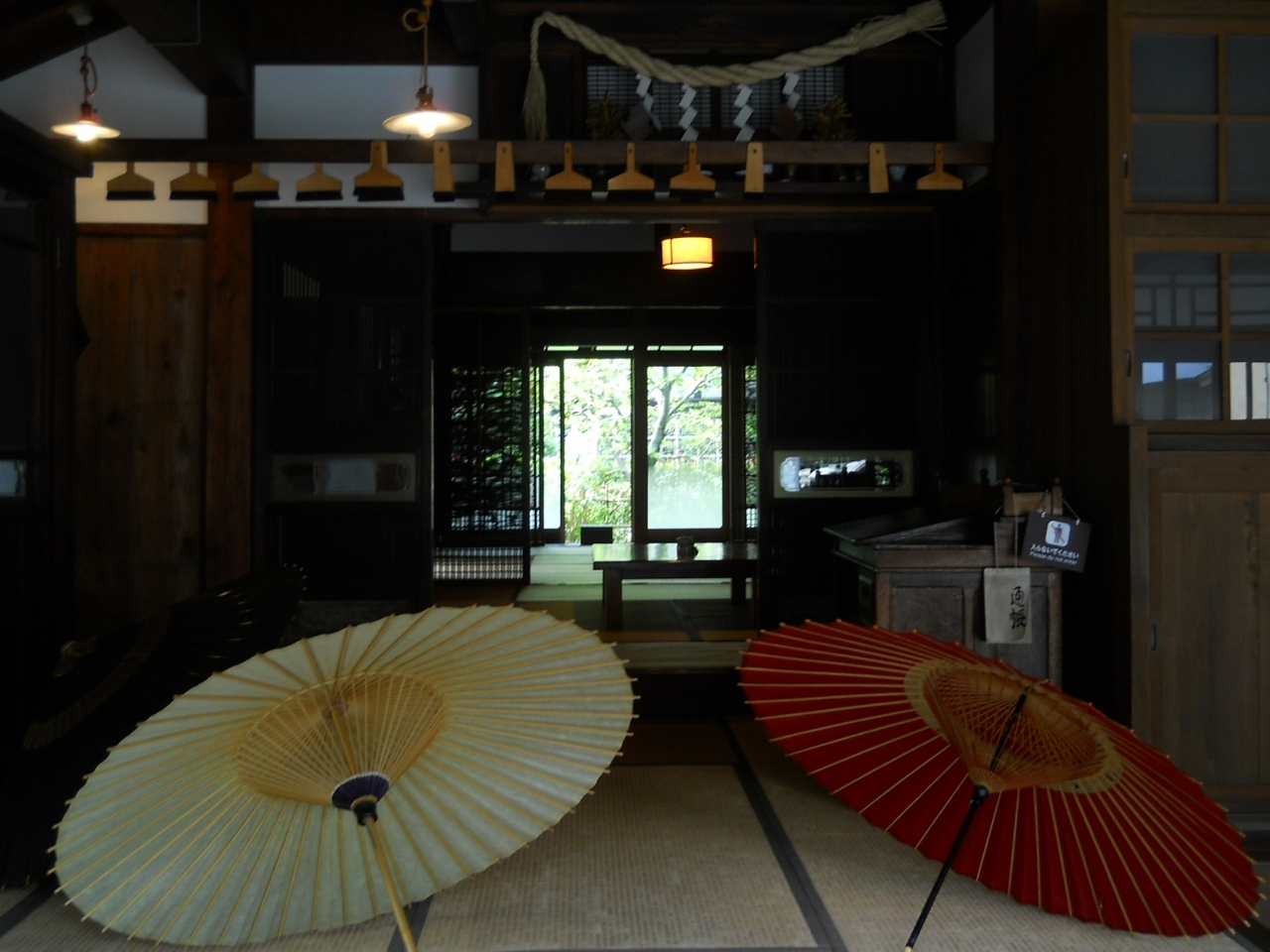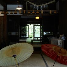 玄関の右側のスペースには和傘のパーツや作り方の展示があります。