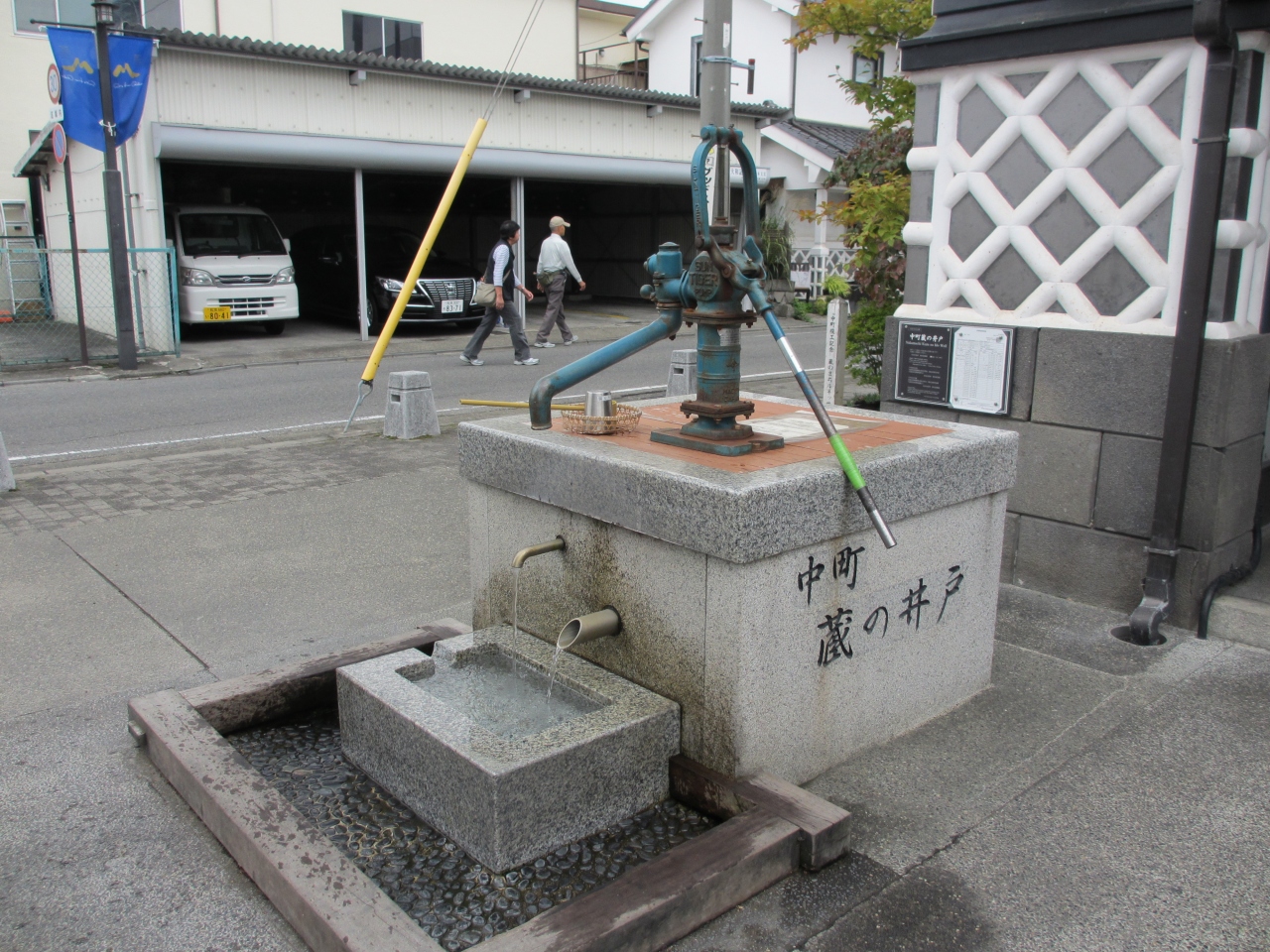 中町通り中ほどにあります。明治21年の大火によって中町の大半の家屋が焼失し、それを機に耐火性の高い土蔵造りの建物が建てられました。元造り酒屋を移築した中町蔵の会館の前庭にポンプ井戸があります。地下25mまで掘り下げ、汲み上げられてます。