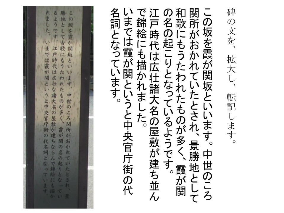 霞が関坂は、同じく総務省前に設置されている霞が関跡の標識柱の傍から、坂が始まっています。