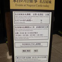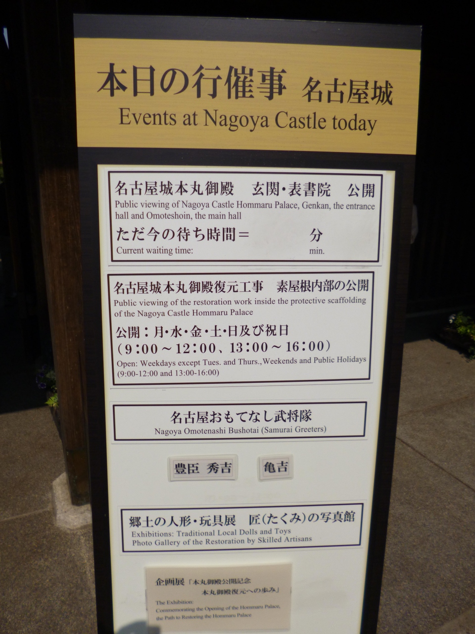 名古屋城 東門は入り口の一つ。正門のほうが雰囲気がある。地下鉄の市役所駅から近い。イベントや二の丸庭園からの観光ならこっちが便利。本日の行催事看板があり、待ち時間の表示やおもてなし武将隊の出演者があり便利。