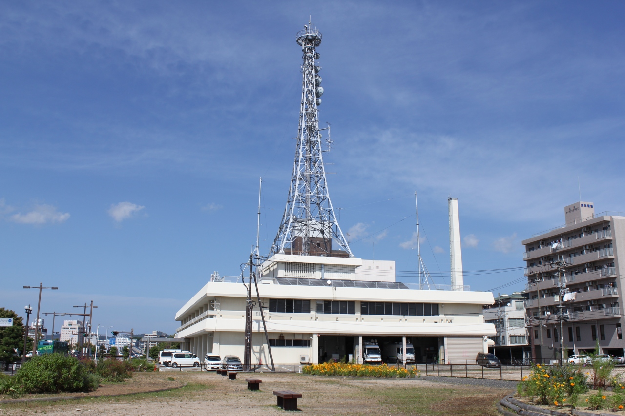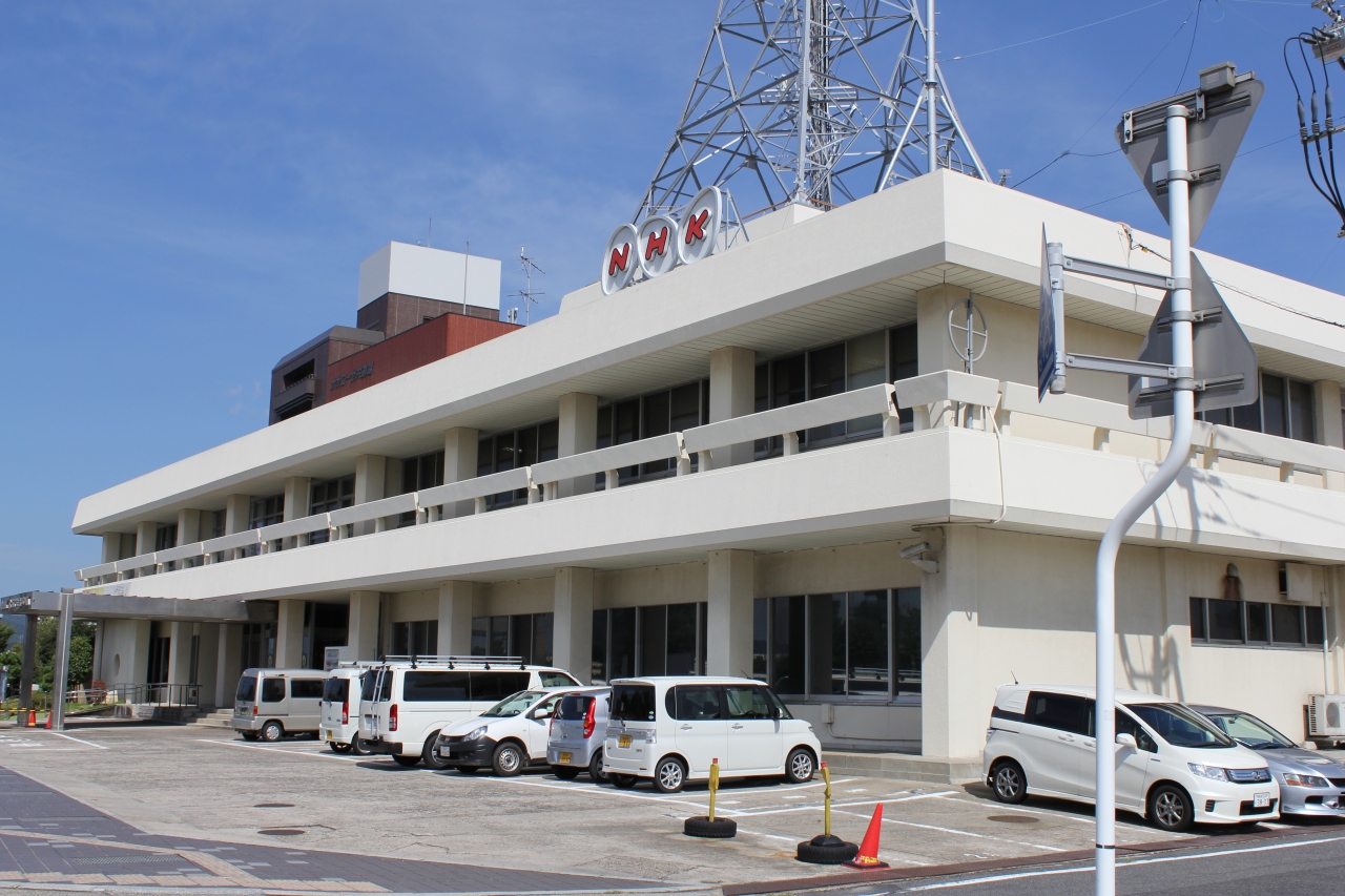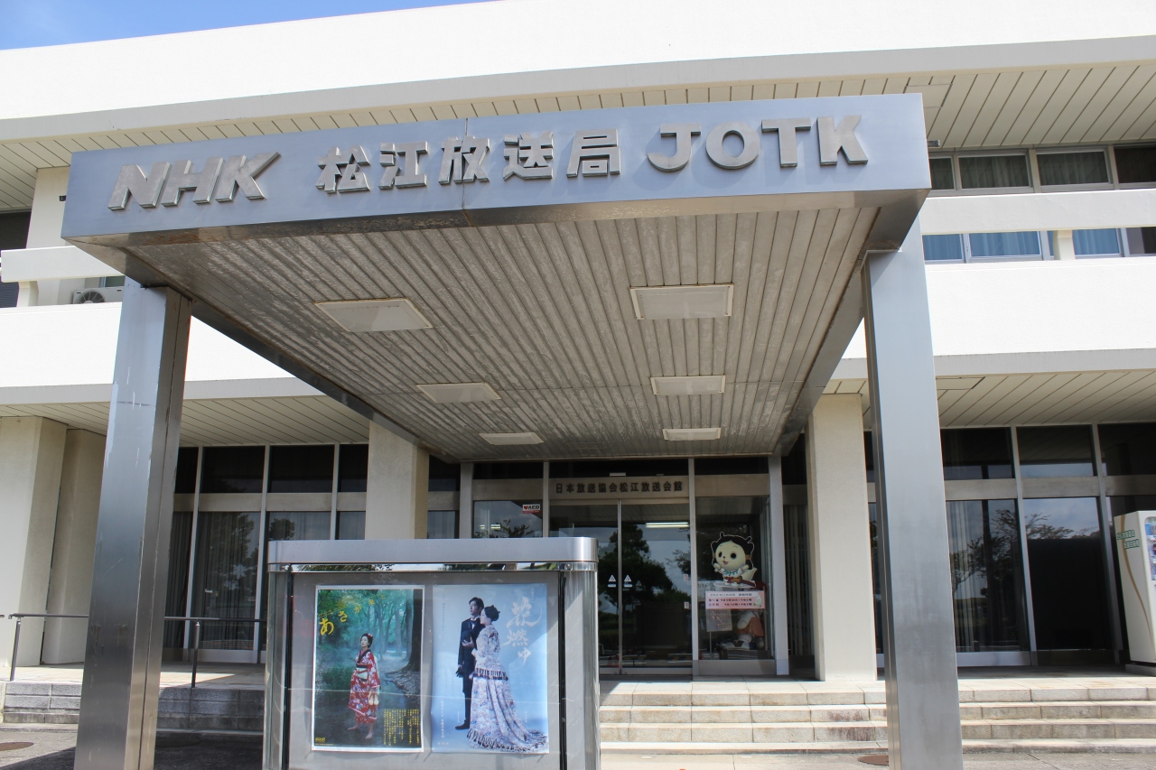 宍道湖の畔にあるNHKの松江放送局。建物の上には高い電波塔が立っておりいかにも放送局といった感じがする建物です。松江でNHKを見ているとこの電波塔から撮影していると思われる松江大橋と宍道湖の風景が必ず放映されます。建物の壁には地元で放映中の番組ポスターが張ってあり街になじんでいます