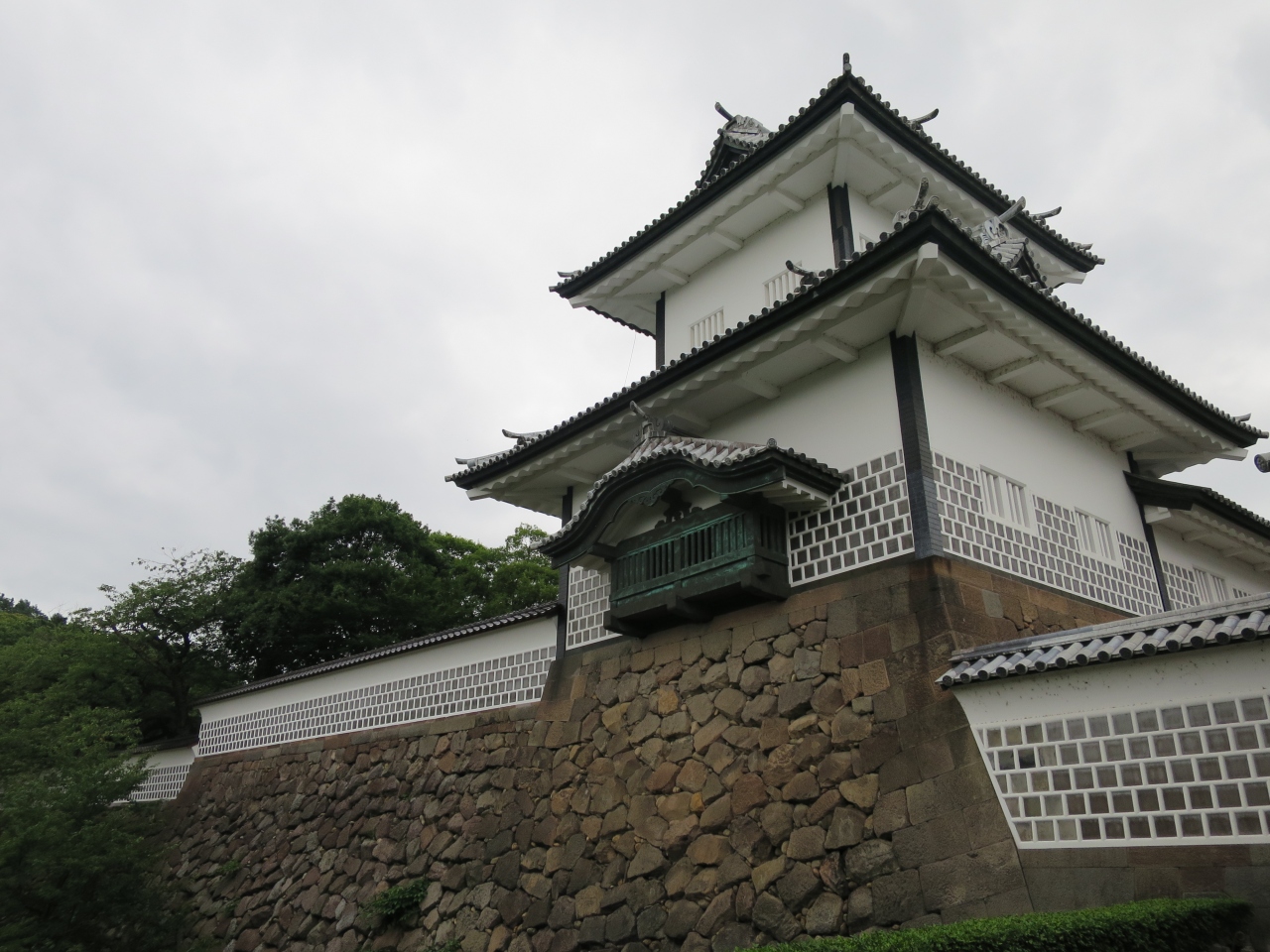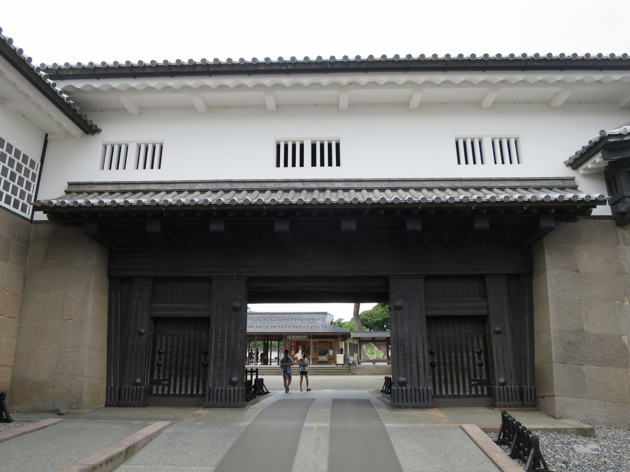 金沢城を代表する景色で、櫓の間を長屋で繋いだ枡形門になっており、非常に重厚感があります。この場所からは間近に海鼠壁、鉛瓦、石垣がいっぺんに見られる場所で見応え十分です。