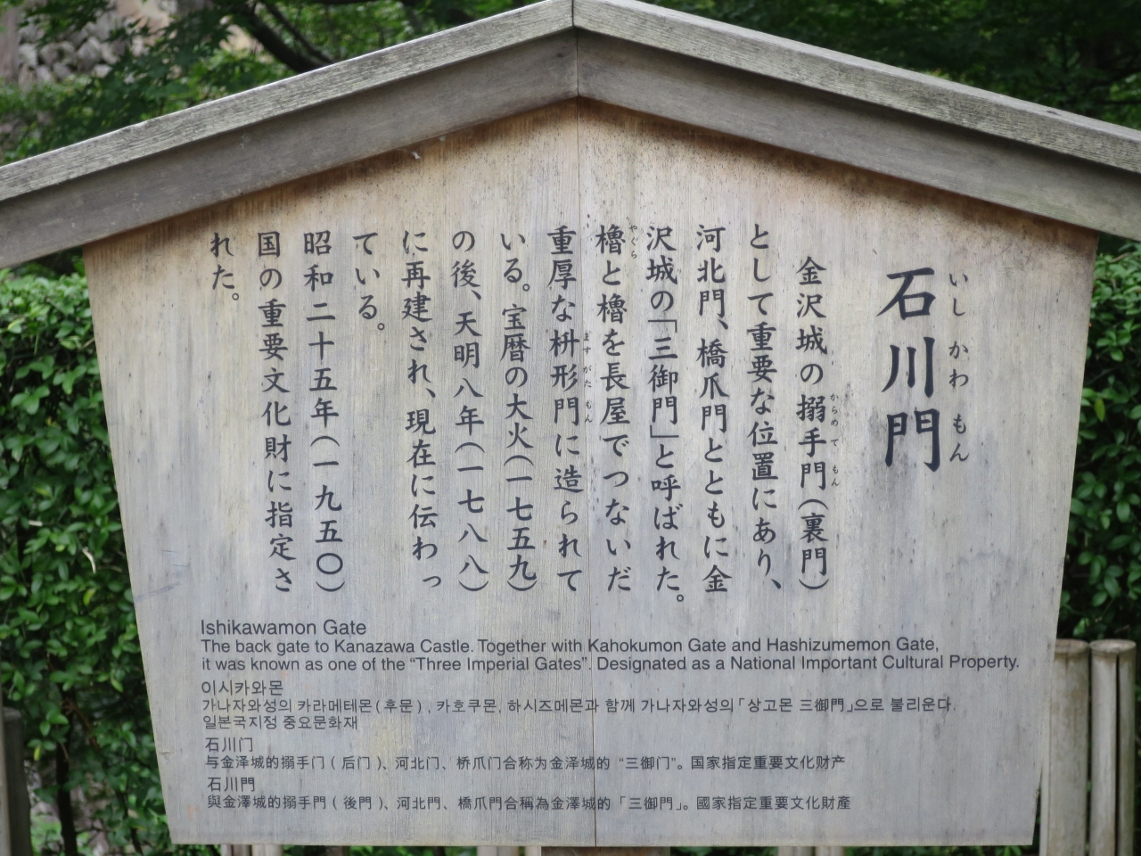 金沢城の東側にある現存する重要文化財に指定されている搦手門で、三御門の一つです。兼六園の桂坂口から道路(百間堀)に掛かる石川橋を渡った先に石川門があります。