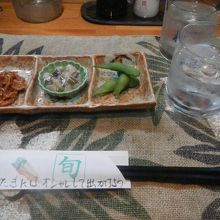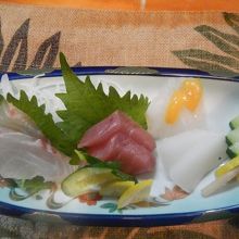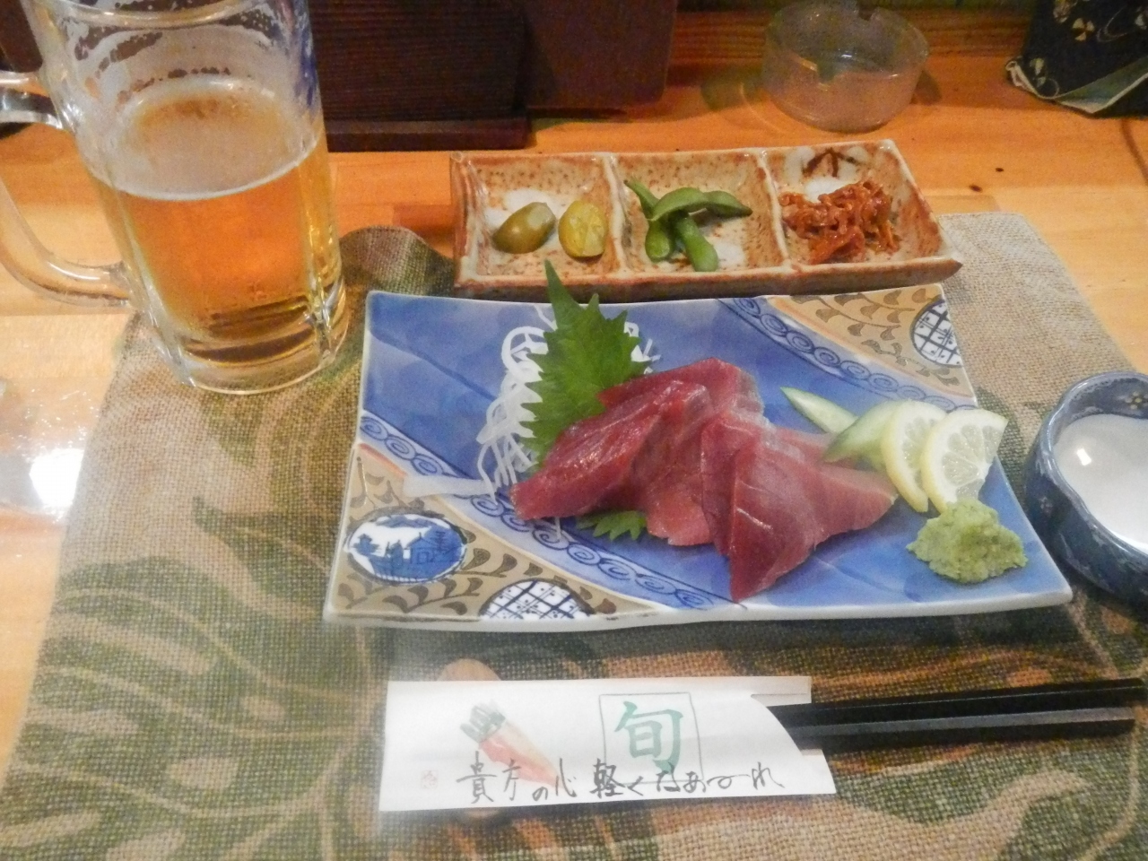 2日目はまず、お通しと黒糖焼酎。普段焼酎は飲まないが、黒糖焼酎は奄美の特産物なので飲んでみる。後は刺身の盛り合わせとビール。魚の名前を聞いたが、現地の呼び名と標準的な呼び名が異なるので覚えきれなかった。