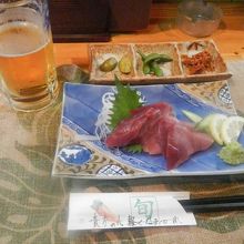 初日はホシカツオの刺身でビール。現地ではウブスとと呼んでいる。