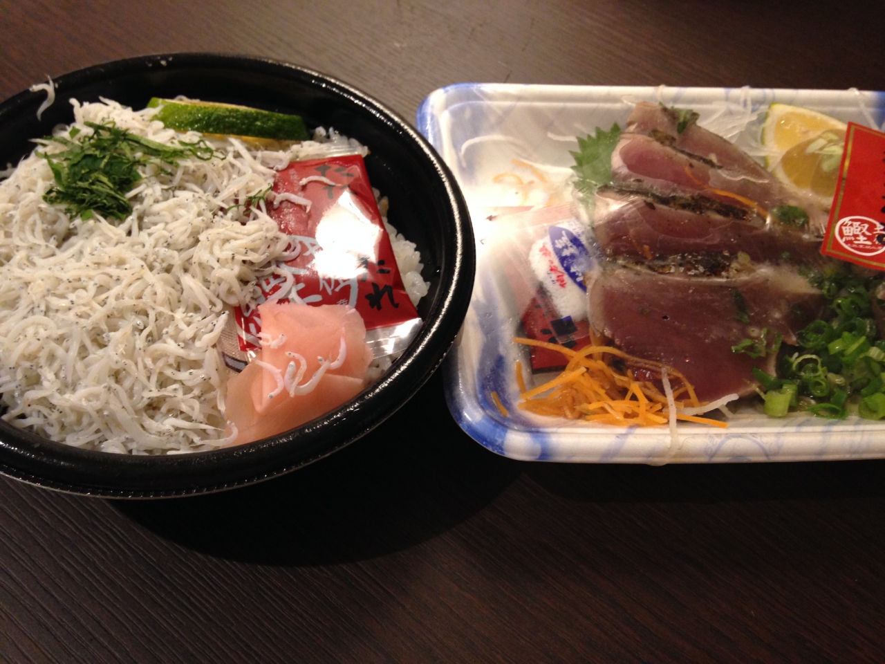 市場内で食事をしたかったのですが席が確保できずホテルで食べるように購入しました。ちりめん丼は美味しかったです。エビのテルミドールも売っていました。カツオのお刺身にはニンニクスライスが添えてあり凄い臭いが次の日まで残っていました。カツオにもちりめん丼にもカボス?かん吃系のフルーツがついていて、さすが土佐料理と思いました。