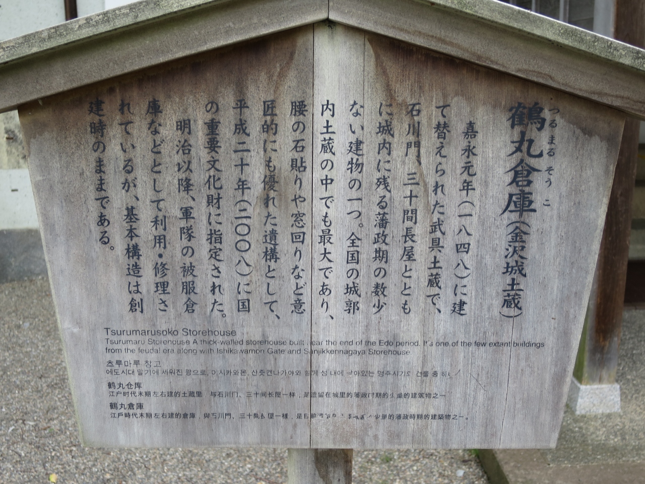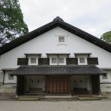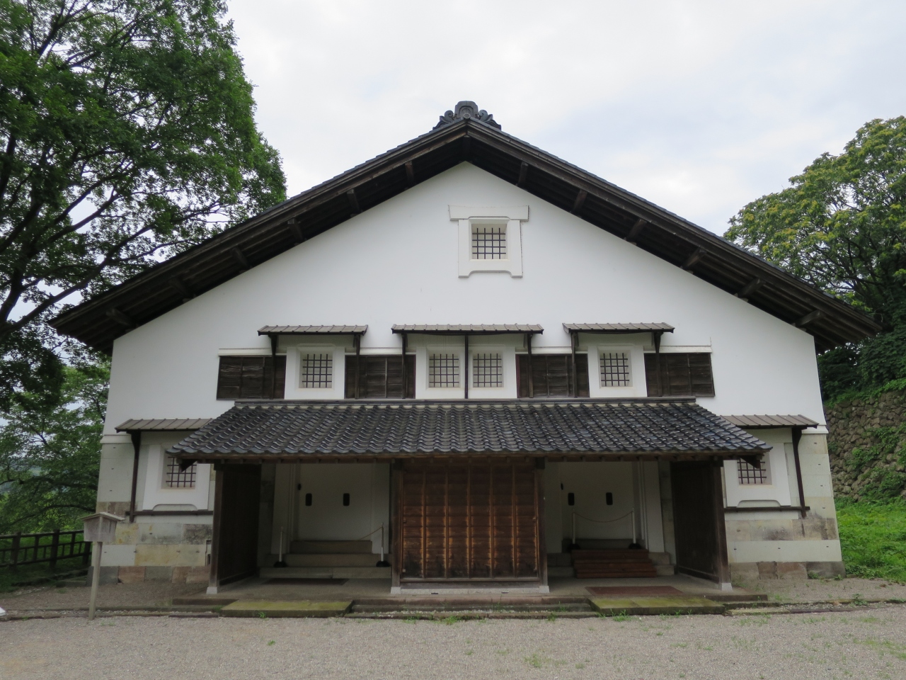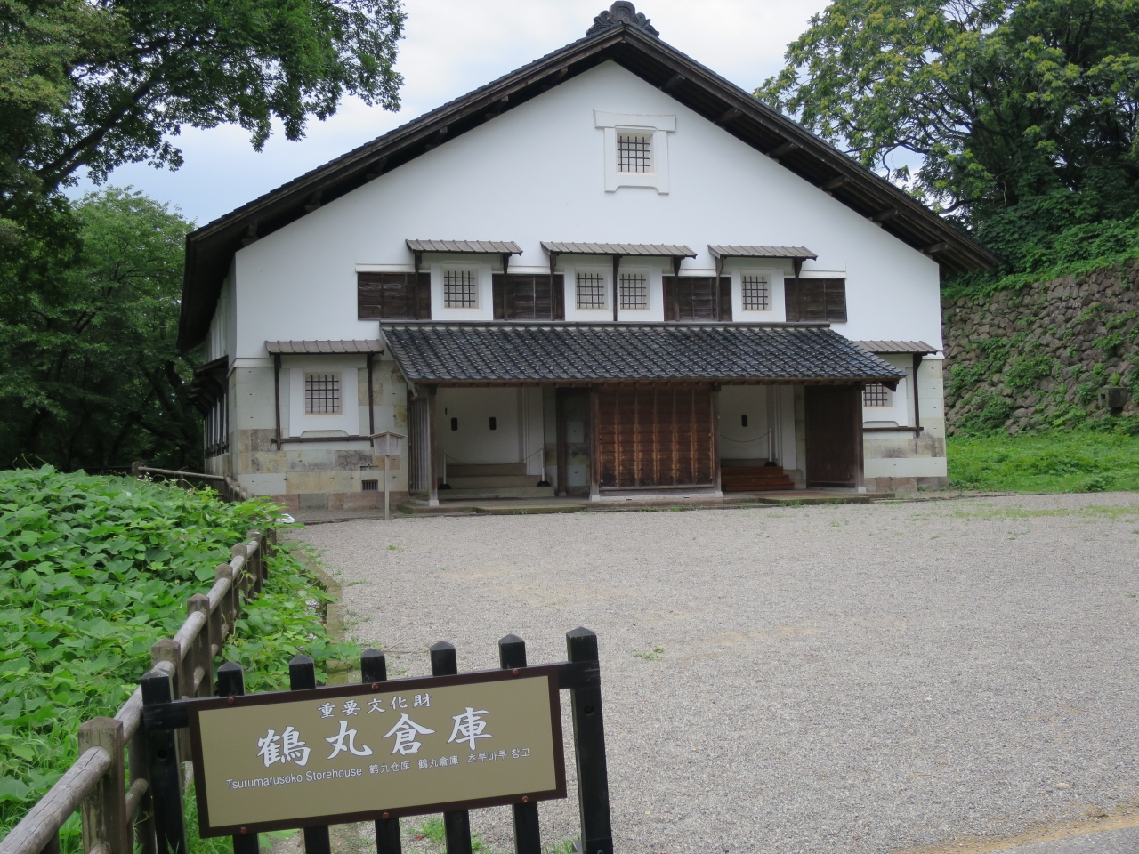 金沢城の場内では少し離れた鶴の丸広場のそばに鶴丸倉庫があります。場内に現存する3つの建物の一つで、1848年に建てられた土蔵造りの武具倉庫で、重要文化財に指定されています。外見的には、他の城の建物と感じが異なり、違和感を感じます。