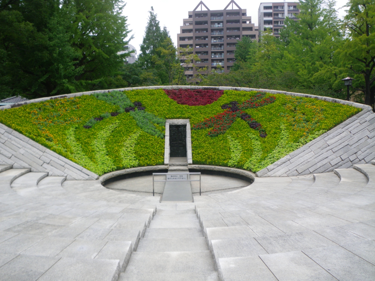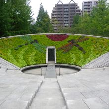 横綱町公園の中でとくに目立つ慰霊碑でした。すり鉢状になっていて、扇型の部分にはいろんな植物で秋らしいとんぼの絵が描かれていました。なかなか見事です。すり鉢の一番下は池になっているようですが、水はありませんでした。
