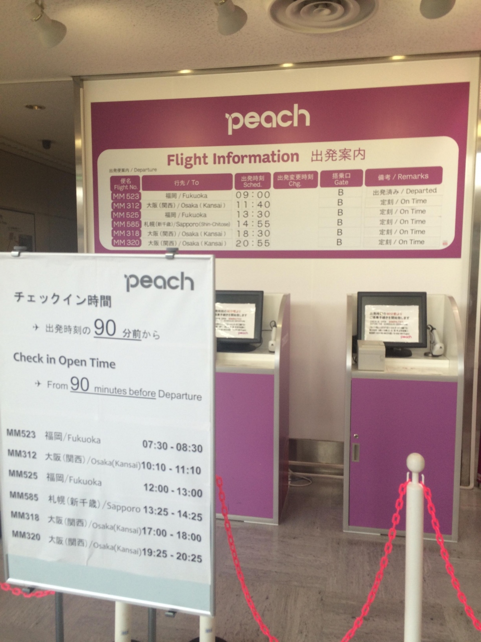 通常LCCは第3ターミナルを使用していますがPeachは第1ターミナルを利用しています。PeachチェックインカウンターはANA国内線チェックインカウンターと国際線到着エリアのちょうど中間地点にあります。第1ターミナルは便利ですがLCCは第3ターミナルで統一していただけると利用者には分かりやすいですね。