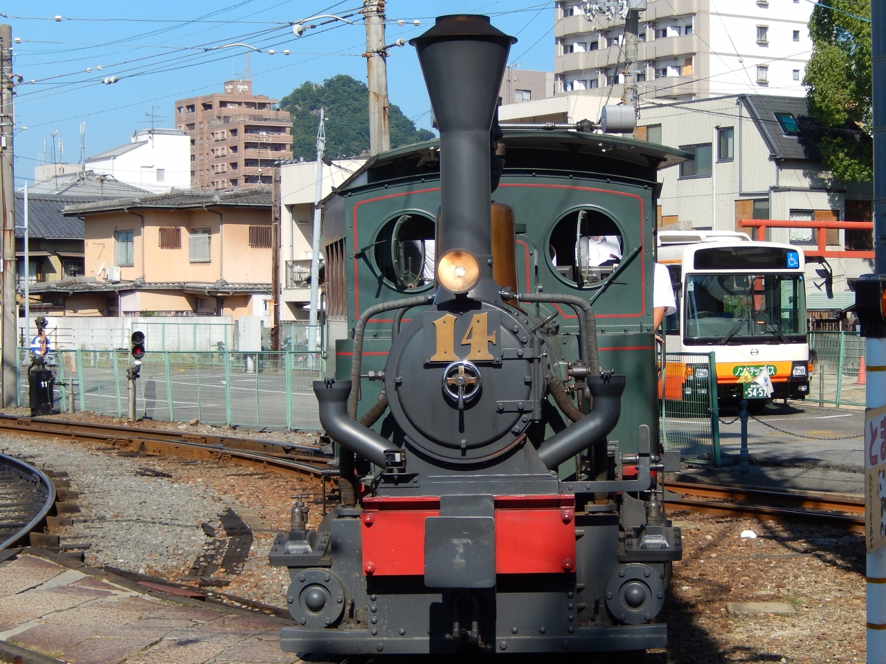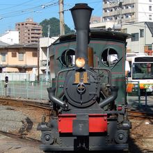 松山に来たら是非とも見ておきたい電車です。蒸気機関車と牽引する列車のことで、夏目漱石の小説『坊っちゃん』の中で「マッチ箱のような汽車」として登場していて、主人公の坊っちゃんがこれに乗ったことから坊っちゃん列車と呼ばれるようになりました。1日に数本運行されていて、1乗車300円でしたが、10月1日から500円に値上がりしました。