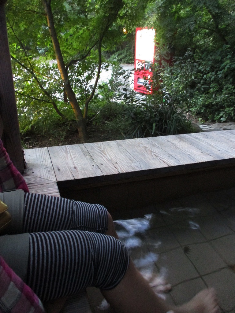 旧福知山線の「廃線ウォーク」を終えた人たちには、日帰り入浴や、無料で入れる足湯などが人気です。