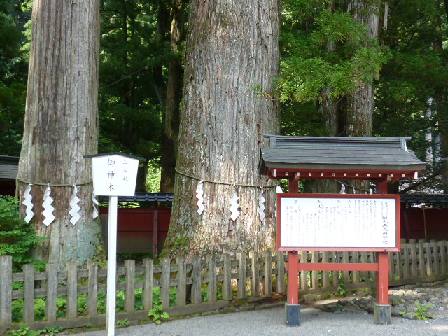 日光東照宮から日光二荒山神社へと続く参道は「上神道(かみしんみち)」と「下神道(しもしんみち)」があります。杉木立の参道沿いにも樹齢約400年以上経つ、御神木があります。そして境内には歴史ある社寺に相応しい大樹が至る所にみられます。御神木の中でもひと際大きく長い歴史を見守り続けてきた縁結びの御神木には「杉に楢のやどり木・縁結びの御神木・すぎ(き)ならいっしょに!好きならばと一緒になりました」と立札があって、ちょっと笑いを誘う内容でした。御神木に祈りを捧げましょう。
