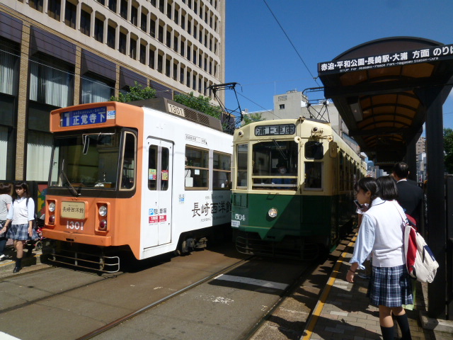全国の都市では、まだまだ路面電車が運行されているところが多くあります。庶民や我々のような観光客の足として重要な役割を果たしていますね。ここ長崎でもそうです。坂道が多い長崎ですが平坦なところを便利良く走行しています。長崎駅前からグラバー園へ行くのも良し、平和公園方面へ行くのも良し、大活躍です。料金は均一で120円でしょうか、安く利用できまーす。ご利用を。。。