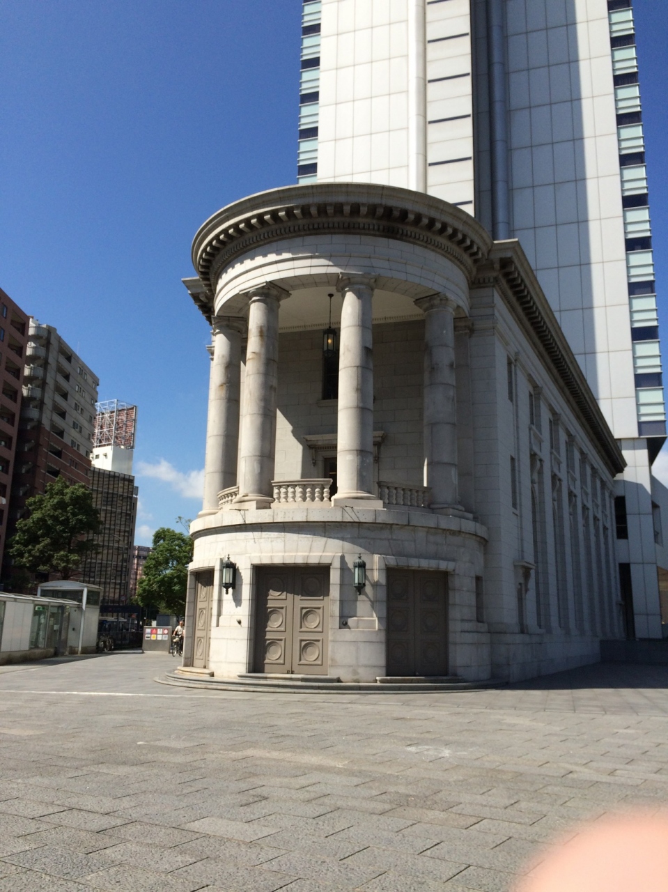 1929年に建てられた第一銀行横浜支店の建物をごく一部だけ残して、超高層のオフィスビルに建て替えています。昔の建物の部分は、カフェやイベントスペースとして文化施設として利用されているようです。しかし、実際に見るとオフィスビル部分が大きいので、高層ビルの脇に昔の建物がへばリついているようにしか見えません。ここまで違和感があるのもかえって現代建築的で面白いかもしれません。