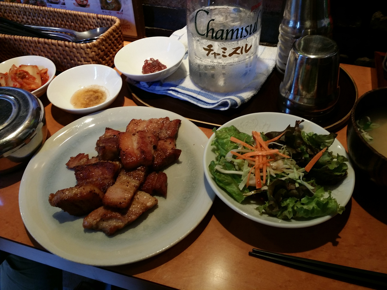 ランチパスポートでサムギョプサル定食。500円。12:30からパスポート利用可。12:20に店に着いたら一番乗り。限定15食なので、早めが吉。スープ、サラダ、ご飯がついて、肉厚でジューシーな豚肉炭火焼き!ごちそうさまでした。