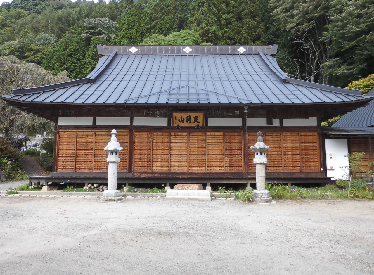 天目山栖雲護國禪寺は臨済宗建長寺派の禅寺。武田勝頼の墓所があることで知られる景徳院から日川渓谷を、さらに4.6kmほど登った上流左岸にある。庭園には本堂右脇から入る。見物するには300円の志納がいる。巨大な自然石で造られた石庭で、よくある石庭のような柔なものではない。嘗ては修行僧が、石の上や木の下で座禅を組んだとのこと。県の指定名勝であり、11月初めから中旬にかけて見事な紅葉が見られる。