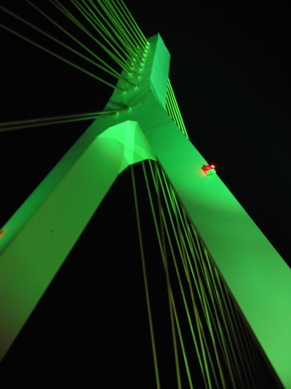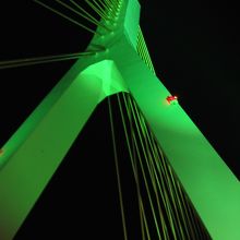 青森駅を一跨ぎしている斜張橋です。車道の両脇には歩道があり青森駅構内を俯瞰することができるので鉄道好きには楽しい風景が広がっています。夜は橋の主塔がライトアップされますが怪しい色彩なのでセンスの悪さを感じます。