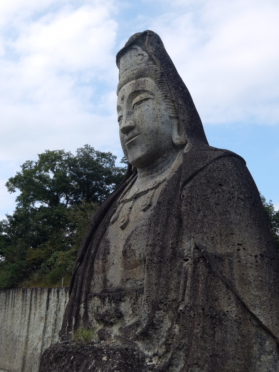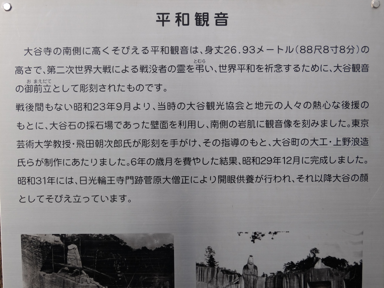 300円かかりますが,大谷寺正面の駐車場を利用し,大谷寺の観音様を見学した後に行くとよいです。すぐです。高さに圧倒されますが,階段があるので,それを上ると平和観音様の顔を近くで見ることができます。おだやかな表情で,見ている方も心洗われる気がしてきます。6年の歳月をかけて造った方々に感謝です。