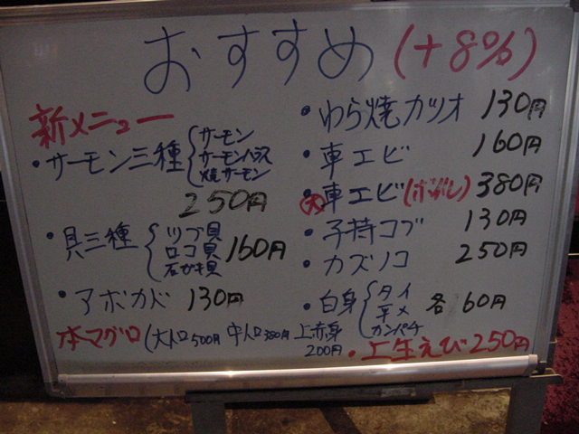 横浜市の中心街としてにぎやかな伊勢佐木町にある回転寿司のお店。気軽に入れる雰囲気です。チェーン店のメニューに飽き飽きしている人にはおすすめ。本日のおすすめが店頭にあったのですが、なんと安い。車エビやカツオは安くて満足できます。