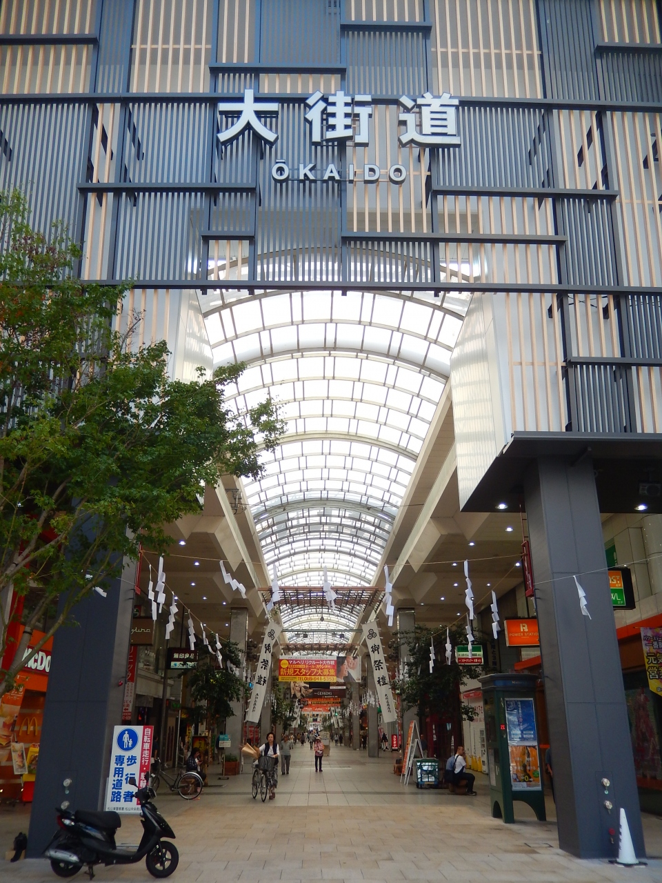 松山市の目抜き通りです。道幅も広く全面アーケードなので、とても歩きやすいです。有名処の飲食店やショップはこのあたりに集まっているので、滞在中何度も通りました。居酒屋、マッサージ店、カラオケ店などもあるので夜遅くまでぶらぶらできます。自転車の乗り入れが禁止されているようで、それを注意するおばさんがいつも待機していました。秋祭りの神輿を担ぐ練習風景も見られました。
