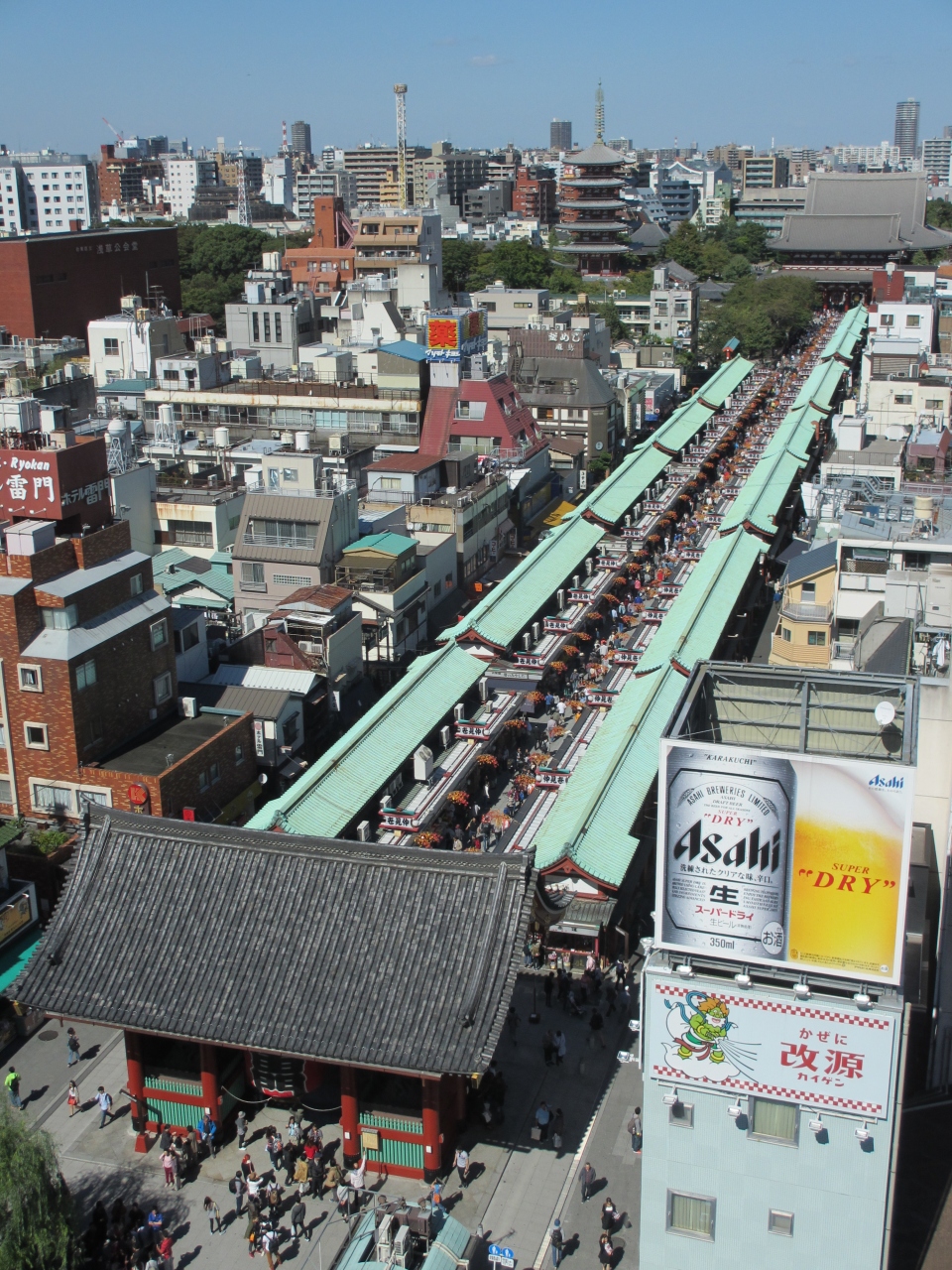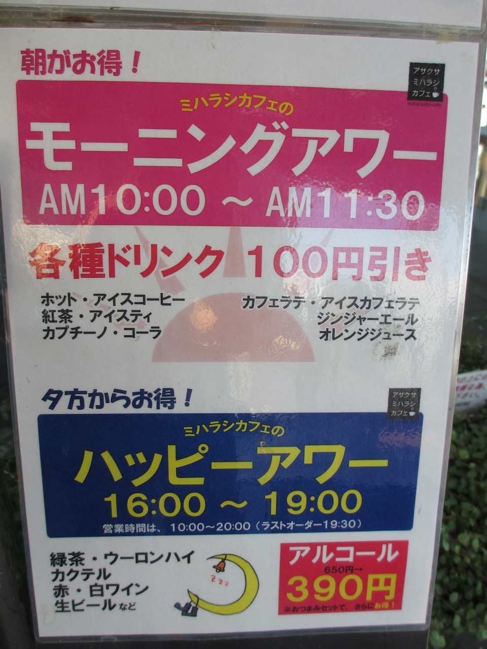 雷門通りを隔て、浅草雷門前に立つ浅草文化観光センター8階にあるカフェです。飲食ができるのは当然ですが、ここからは浅草寺や雷門はもちろん、仲見世を上から見下ろすことができます。隣りにある展望デッキからはスカイツリーも見渡せます。存在を知らない人が多いためか、すいていてゆっくり展望を楽しめます。隠れた穴場です。レストランではソフトドリンク類が100円安くなるモーニングアワーや、アルコールが390円になるハッピーアワーの時間もあります。混雑する仲見世を眺めながらゆっくり過ごすことができます。