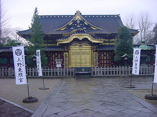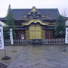 上野公園にある上野東照宮。その社殿です。まさに日光東照宮と並ぶ本格的な建築物で、細かいところにも日本の建築技術の歴史を垣間見ることができます。唐門が純金箔造りなので、正面から見てもそのきらびやかさが目立っています。