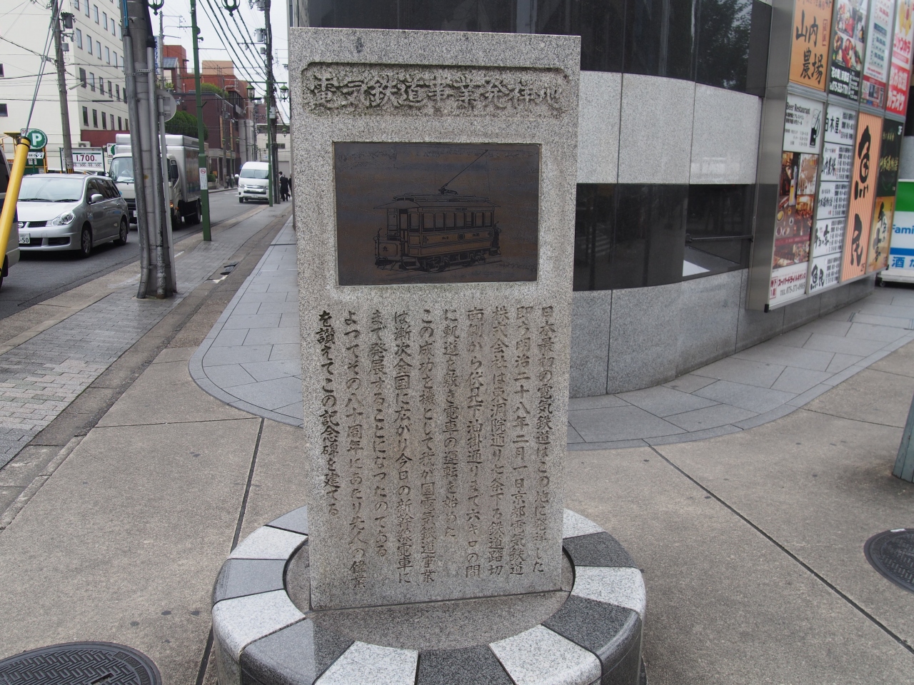 京都駅前から東側に歩いて3分ほどのビルの前に電気鉄道事業発祥の地の碑が建っています。明治25年に琵琶湖疎水を利用した水力発電の電気を利用して電気鉄道(路面電車)が京都と伏見のあいだの6kmほどに開通しました。これを記念したものですが、伏見とここ京都駅前に碑が建っています。
