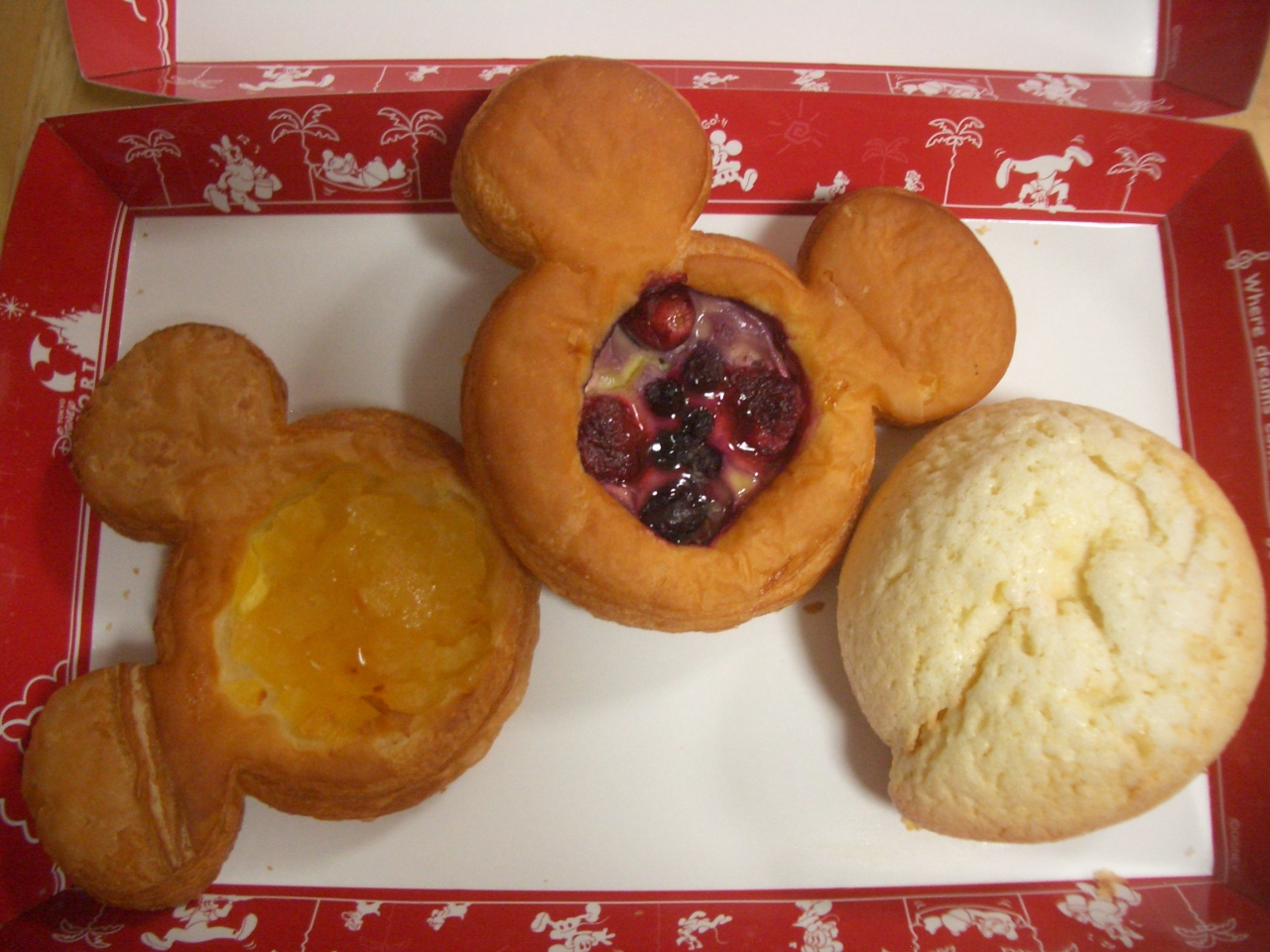 メロンパンみたいな白いパンの中にはクリームが入っており、結構美味しかったです。ミッキー型デニッシュはまぁまぁですが、ランドのスウィートハートカフェで買ったオレンジデニッシュが今のとこ(ミッキー型のパンの中では)一番美味しかった。