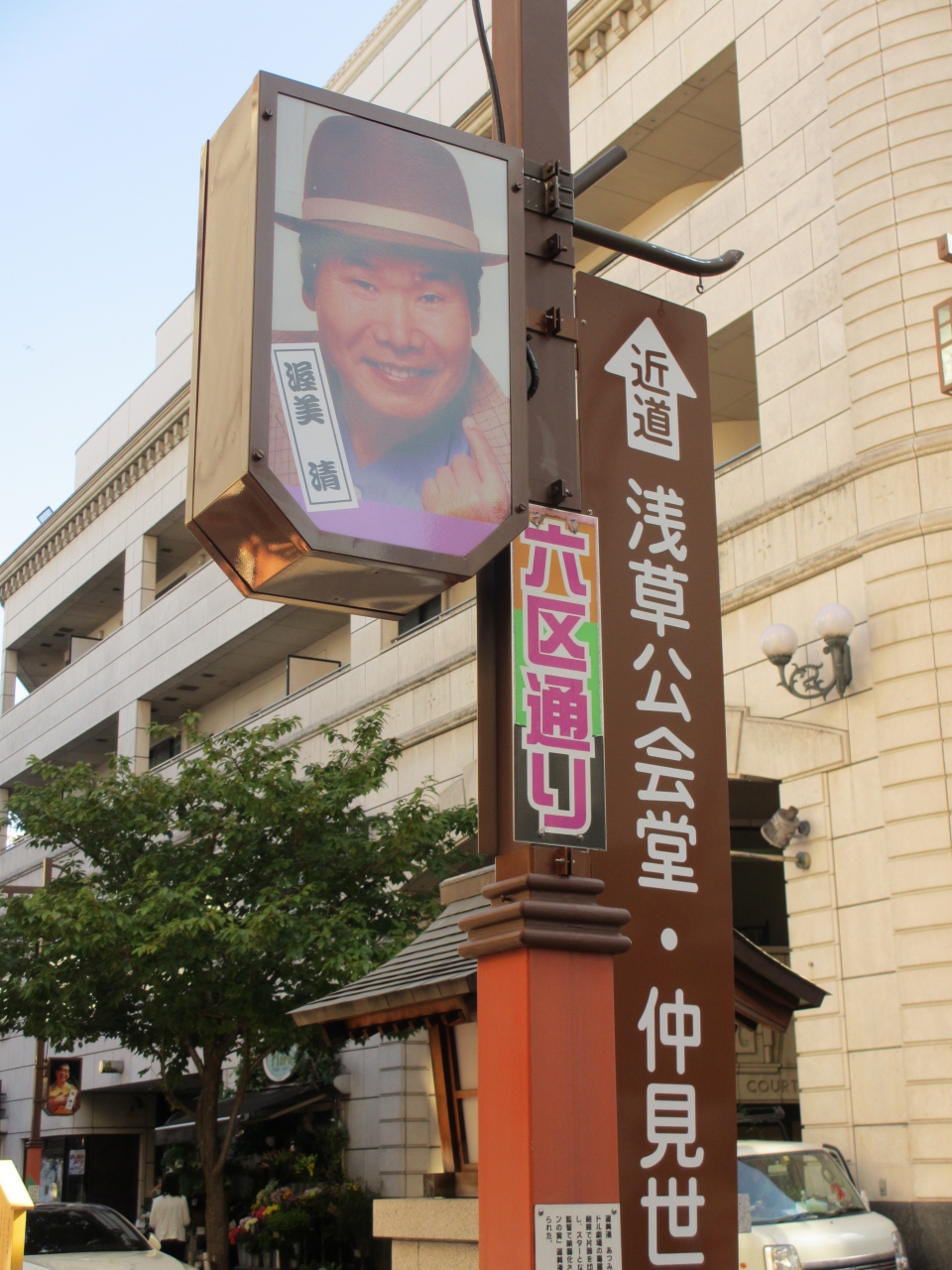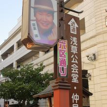 浅草寺から花やしき通りを通り、その終着点を左に曲がると、六区ブロードウェイ通りに出ます。演芸発祥の地らしく、近くには浅草木馬座や浅草演芸ホールなどがあり、呼び込みをしています。さらにブロードウェイ通りを左折すると、浅草六区通りに出ます。道路沿いの柱にはかつてスターだった人たちの写真が飾られています。