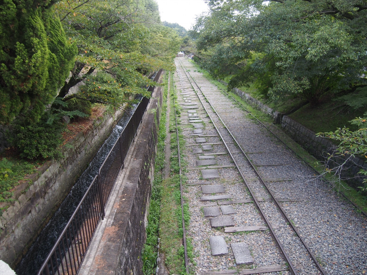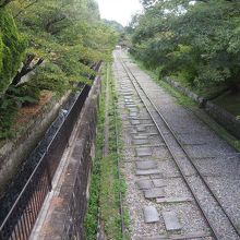 琵琶湖疎水の水を利用した水力発電で船を運ぶのに利用したものです。南禅寺から降りてくると琵琶湖疎水記念館あたりで斜面に続く線路と水路が見えます。京都の町が琵琶湖の水で成り立っていたのがよくわかる景観です。