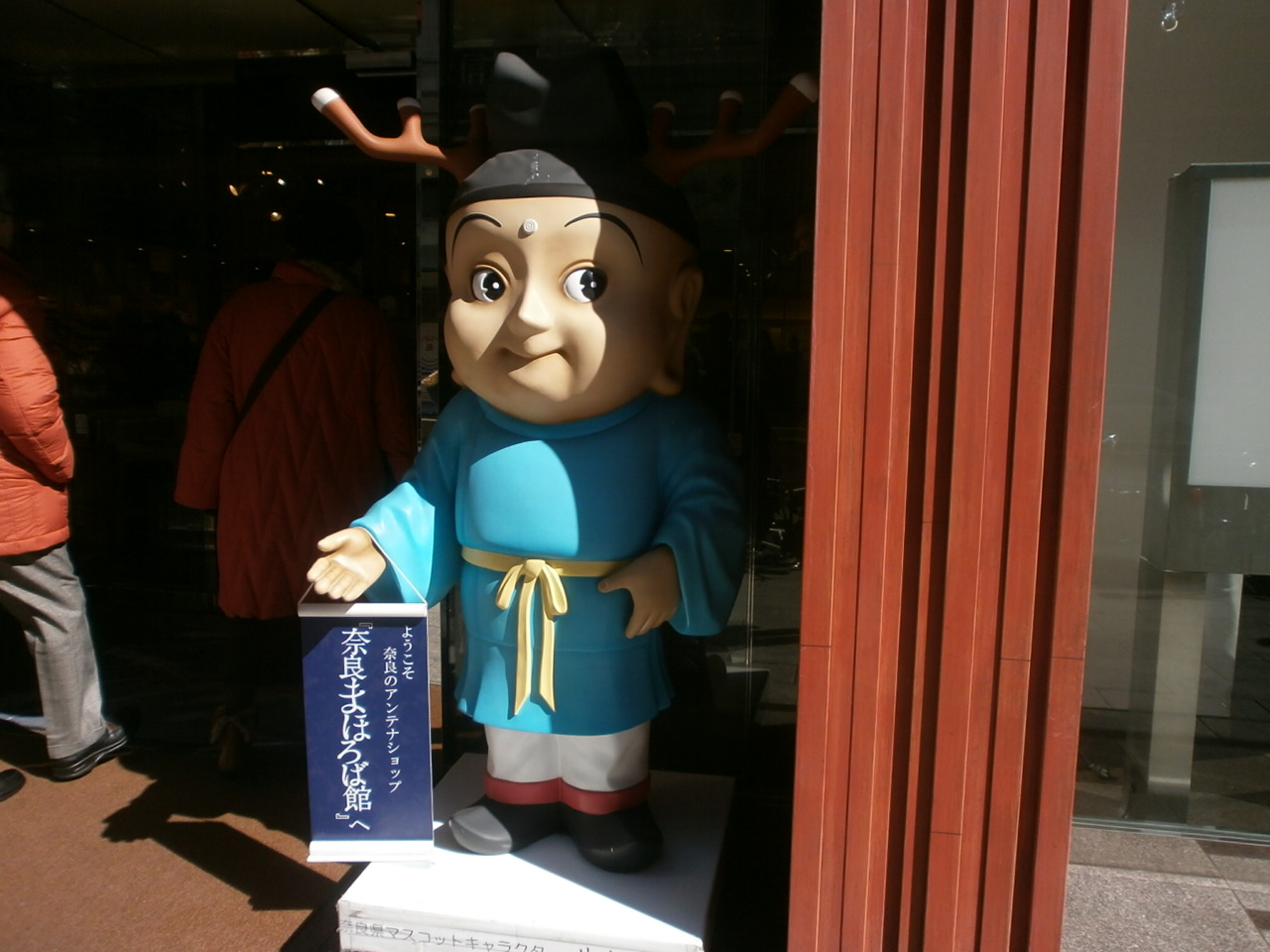 日本橋三越の前の大通り沿いに奈良まほろば館があります。奈良県のアンテナショップがあります。地場特産品の食材やお菓子が売っています。観光のパンフレットや資料も揃っていました。入口には奈良県のゆるキャラのせんとくんも居ました。
