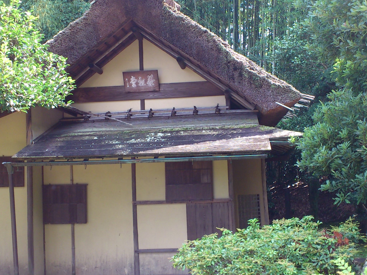 岡山後楽園のかなり奥まった場所にある建物です。近くには花交池と言う池があります。もともとは、利休堂と言う名前だったそうですが、戦災で焼失し再建する時に、日本にお茶を伝えた栄西禅師が岡山出身だったことから、この名前にしたそうです。黄色の土壁が印象的です。
