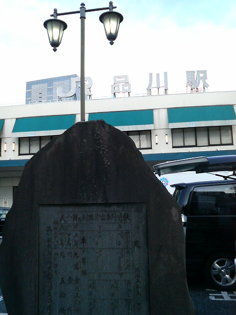 JR品川駅西口を出てすぐ、タクシープールと駅前通りに囲まれた一角に立つ石碑です。